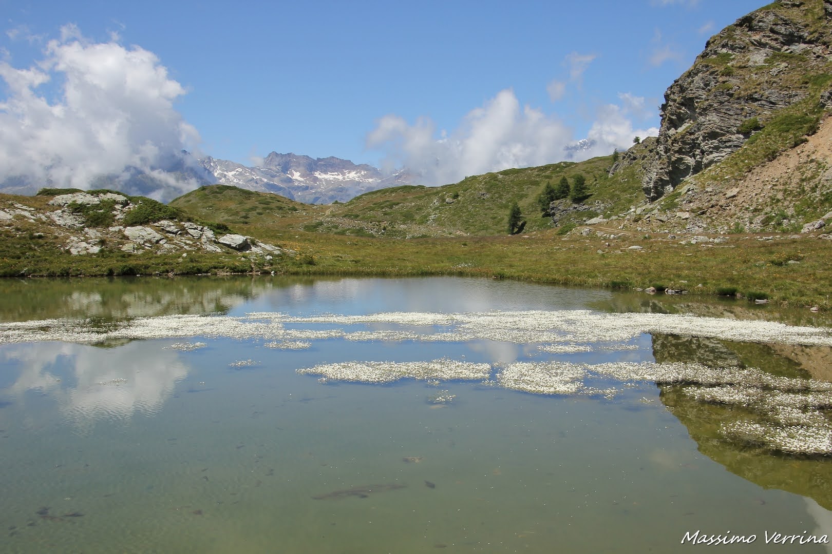 Quando ho scattato queste immagini ho giocato anche sull’aspetto scenografico della location, non solo foto del lago e basta, ma anche prospettive differenti, come ad esempio questi riflessi di nubi che riprendono il colore bianco dei fiori, estendendone in forma creativa il loro sviluppo sulla superficie….
