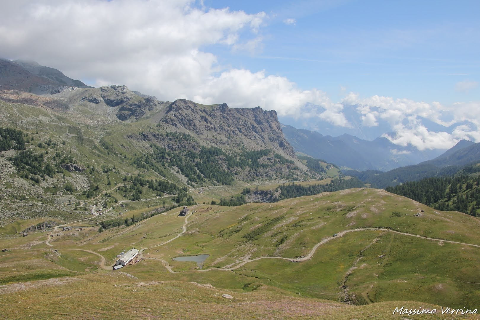 Ero quasi in cima alla dura salita, sono partito dal sentiero che vedete in basso. Mi volto indietro giusto un attimo per ammirare il panorama spettacolare, sotto si vede il primo Rifugio appena passato e quel laghetto che visto da qua ha una curiosa forma a cuore, che rende quasi romantica questa lunga escursione…
