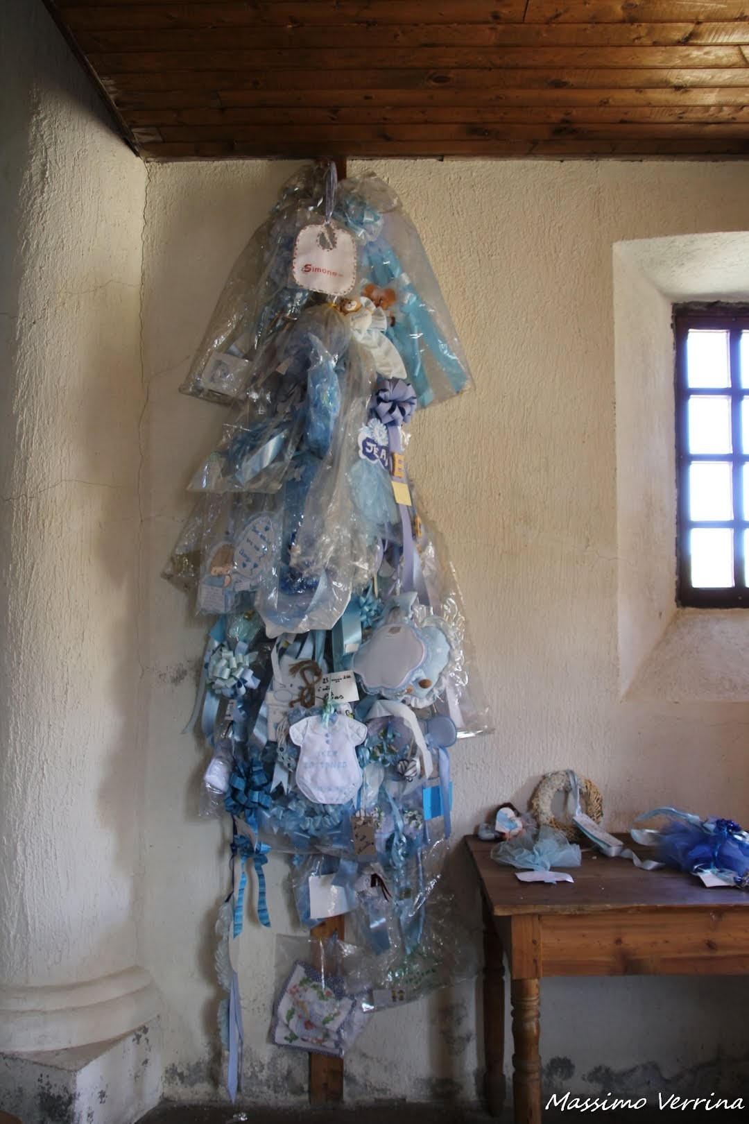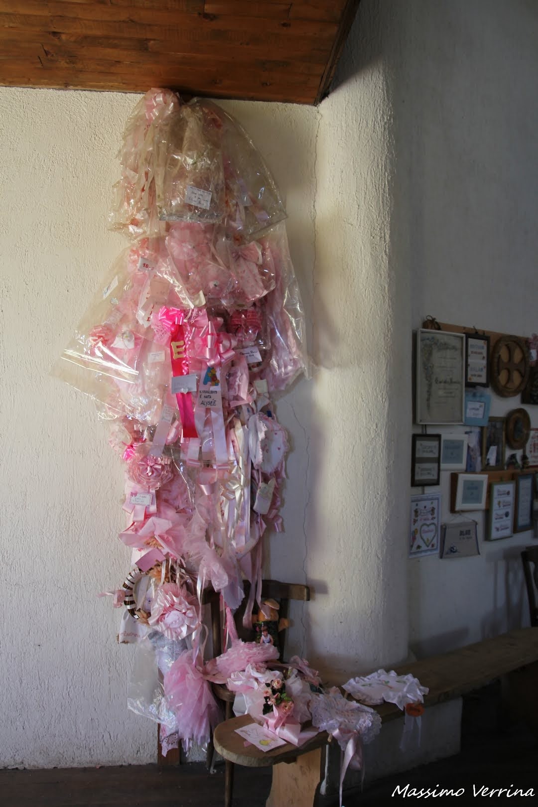 All’entrata di questa curiosa chiesa troviamo ai lati i famosi fiocchi che si appendono alle porte ogni volta che nasce un bambino, sul lato sinistro ci sono quelli da maschi….