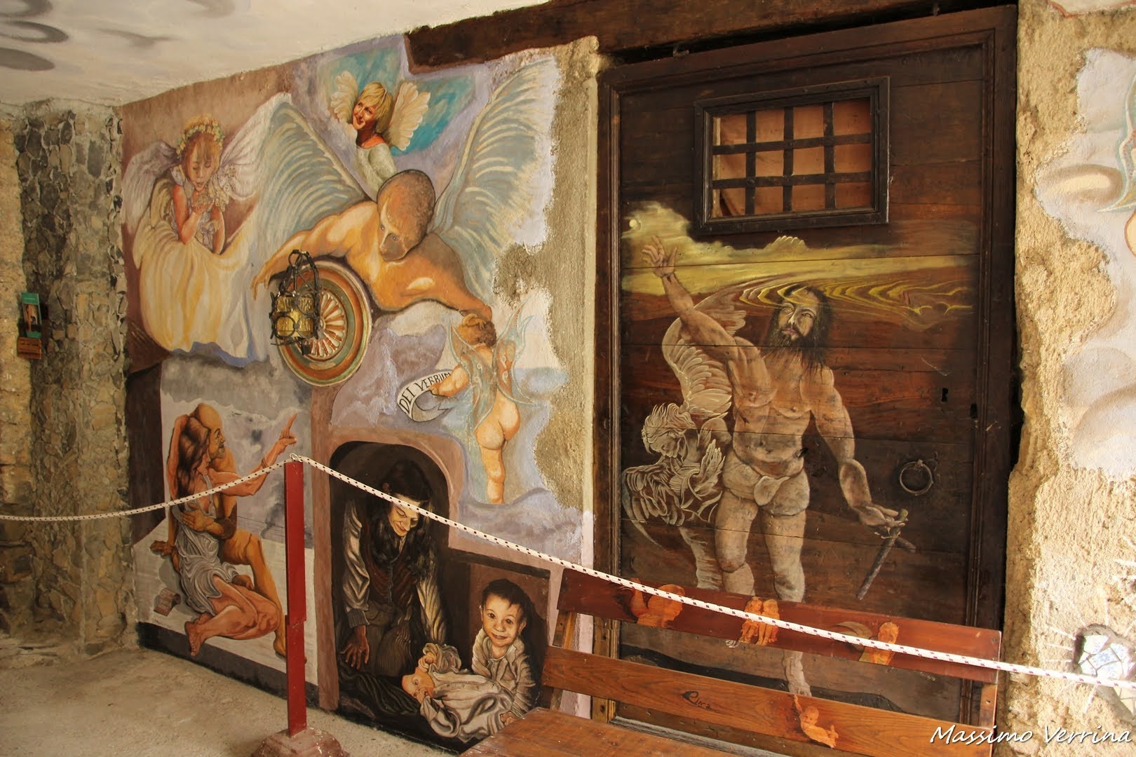 Come potete notare, sia le porte che il muro sono stati dipinti, il percorso sembra unico, non si distingue dove finisce uno e inizia l’altro, anche le panchine entrano in questa scenografia pittorica…