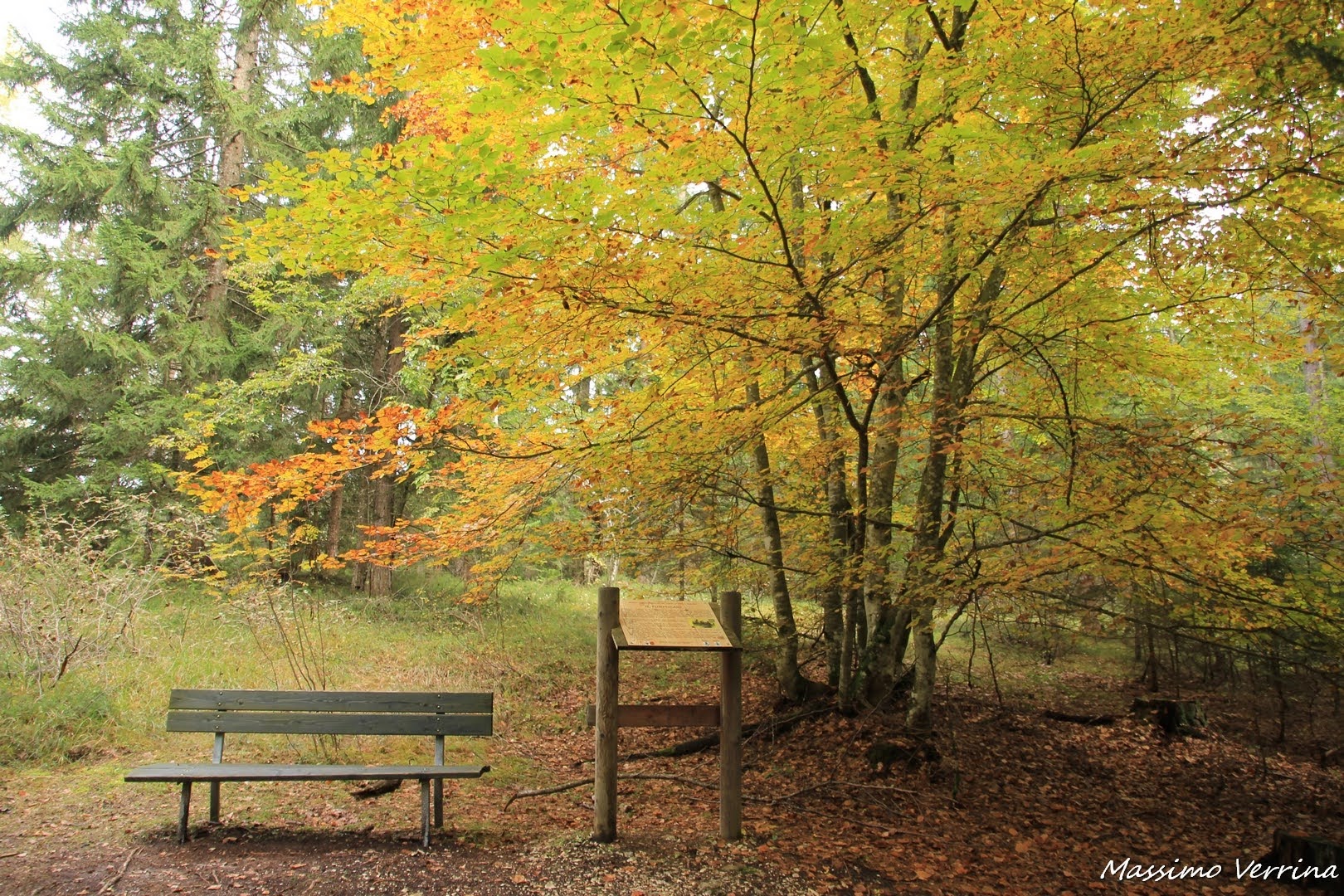 Ero quasi alla fine dell’immenso bosco, un’altra panchina avvolta dalle tinte calde dell’autunno salutava il mio passaggio, accanto un cartello indicava i vari alberi che si possono incontrare in questo posto incantato…