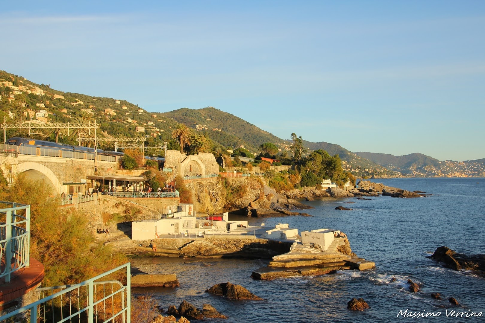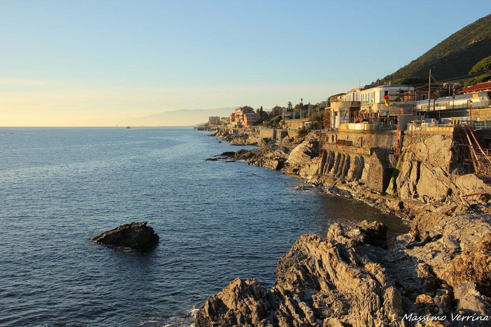 Noi single appassionati di fotografia invece ci andiamo per scattare le foto che state per vedere in questo post. 😉 Questa è la visione della passeggiata verso ponente, il tratto che abbiamo percorso finora. Notate la ferrovia che passa proprio sopra alla passeggiata come vi avevo detto all’inizio. Sullo sfondo le montagne che fanno da cornice in qualche modo alla città di Genova…