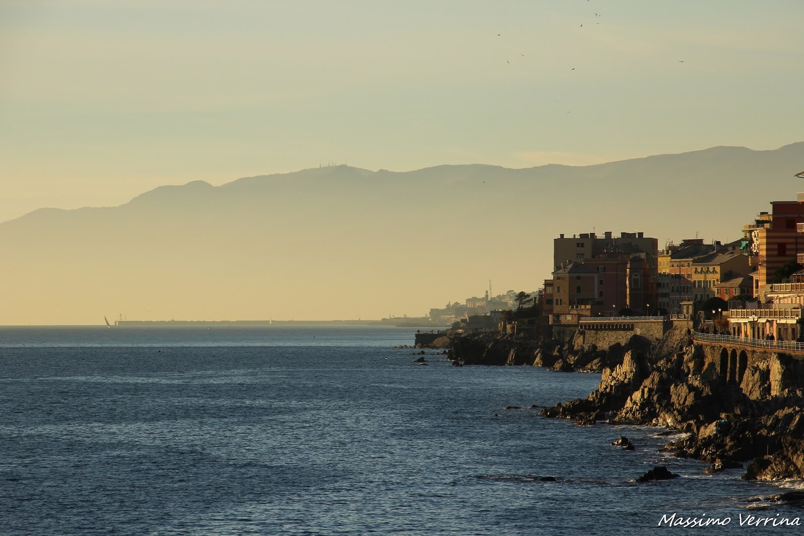 Col teleobiettivo vi faccio notare una cosa molto interessante a livello climatico. Mentre a Nervi di solito il vento da nord arriva attenuato, sulla parte occidentale di Genova le burrasche da nord, specie in inverno sono sempre molto intense. Queste trasportano umidità dalla pianura padana che si può vedere attraverso la densa foschia che segna proprio il tratto interessato dalla tramontana tempestosa…