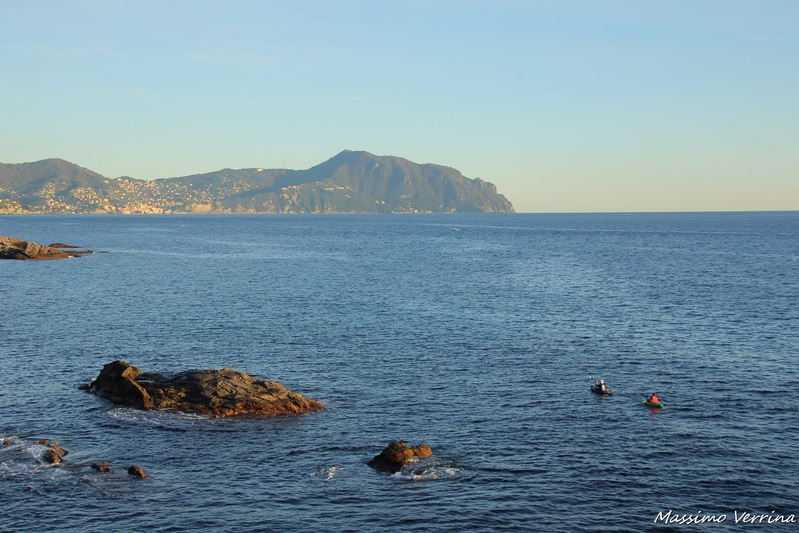 Sempre dalla terrazza romantica dove ci troviamo, ci voltiamo ora verso levante, troviamo i nostri canoisti che proseguono verso il Promontorio, e quei piccoli scogli che emergono qua e la, che contribuiscono a rendere il paesaggio più articolato e meno monotono, naturalmente dal punto di vista fotografico……