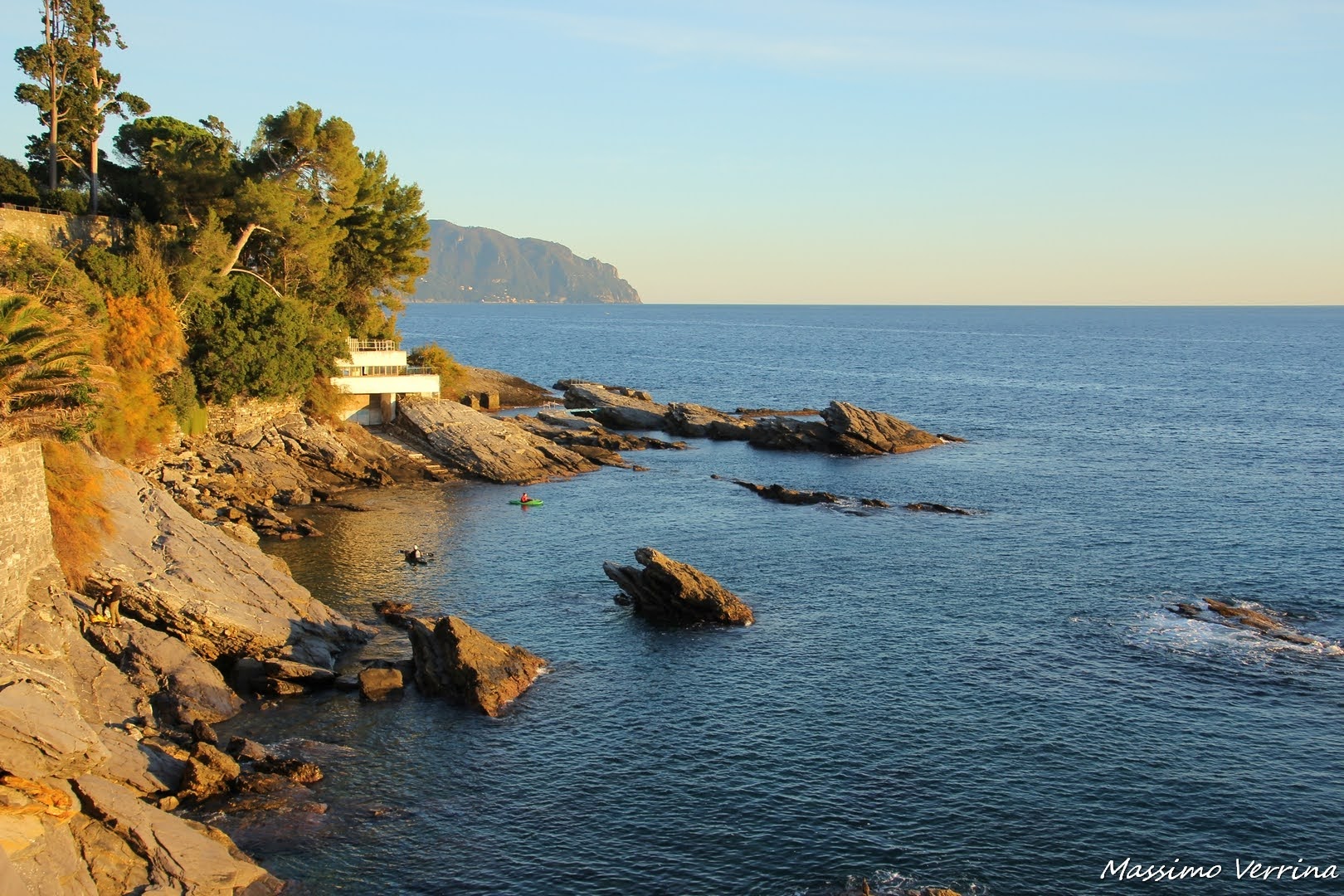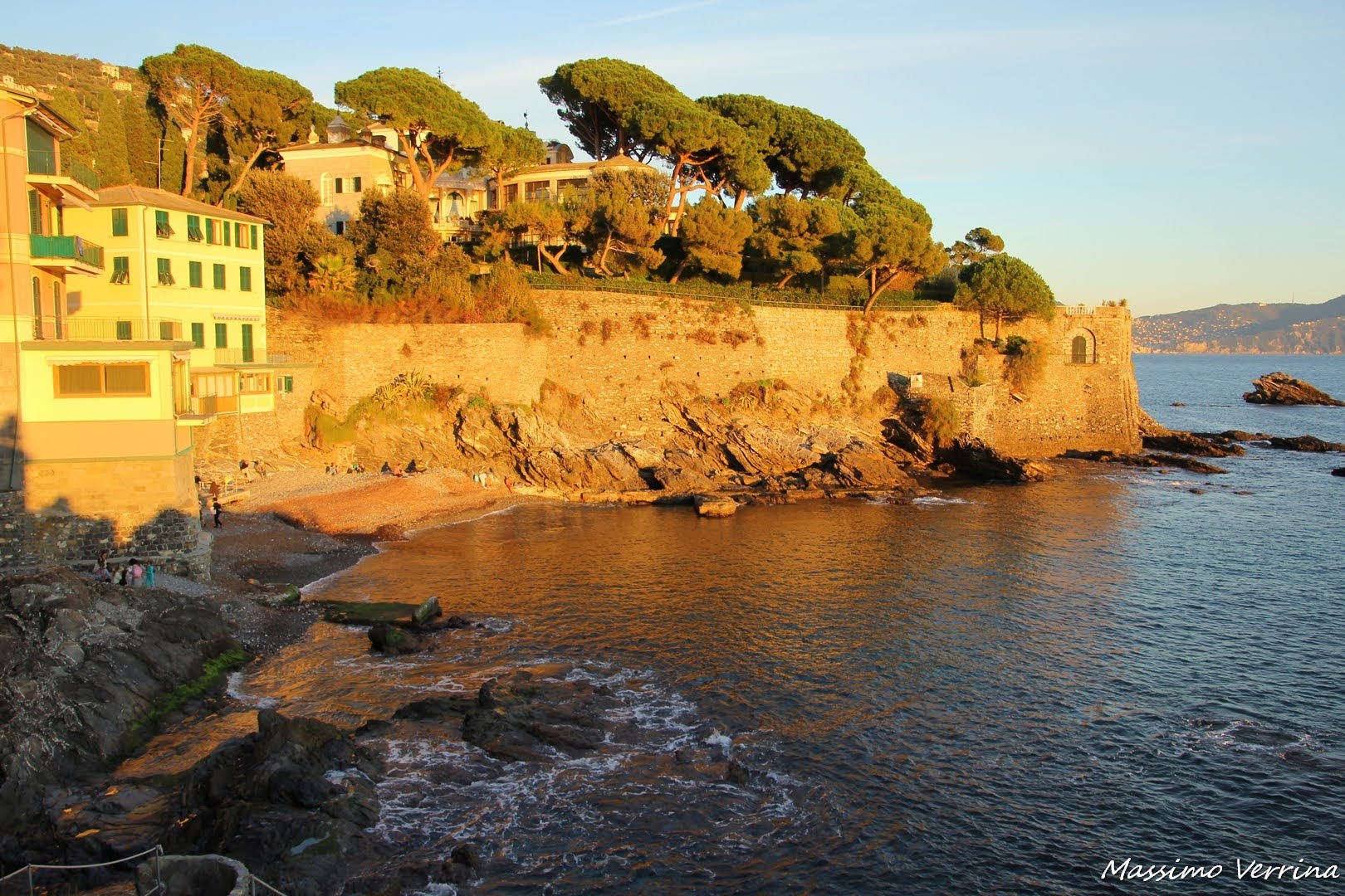 Giunti alla fine della passeggiata ecco spuntare una piccola spiaggetta, d’estate super affollata. Siamo all’ora del tramonto, le luci sono così calde che trasformano l’intero paesaggio. La Villa che vedete di fronte è privata, quindi non visitabile. Chi la abita di sicuro ha una location fantastica!