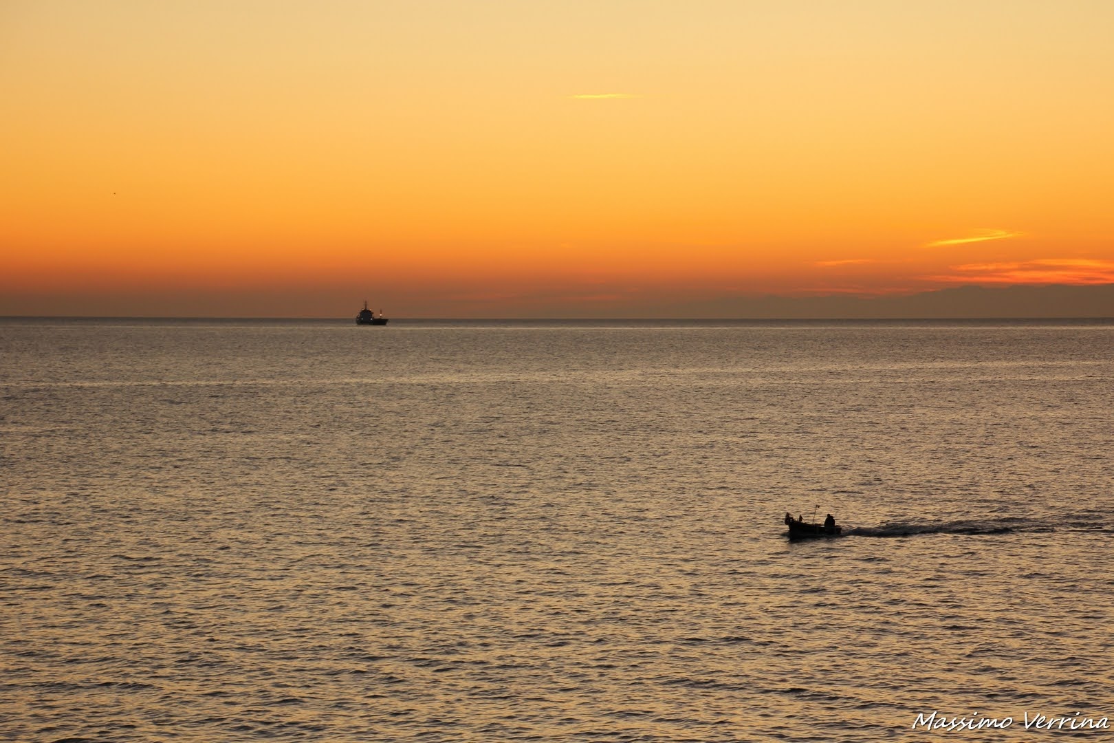 Un pescatore va verso il largo, il rumore del suo motore rompe il silenzio della sera, i gabbiani salutano le ultime luci del giorno volteggiando sopra alla passeggiata, qualcuno si posa sulle scogliere…