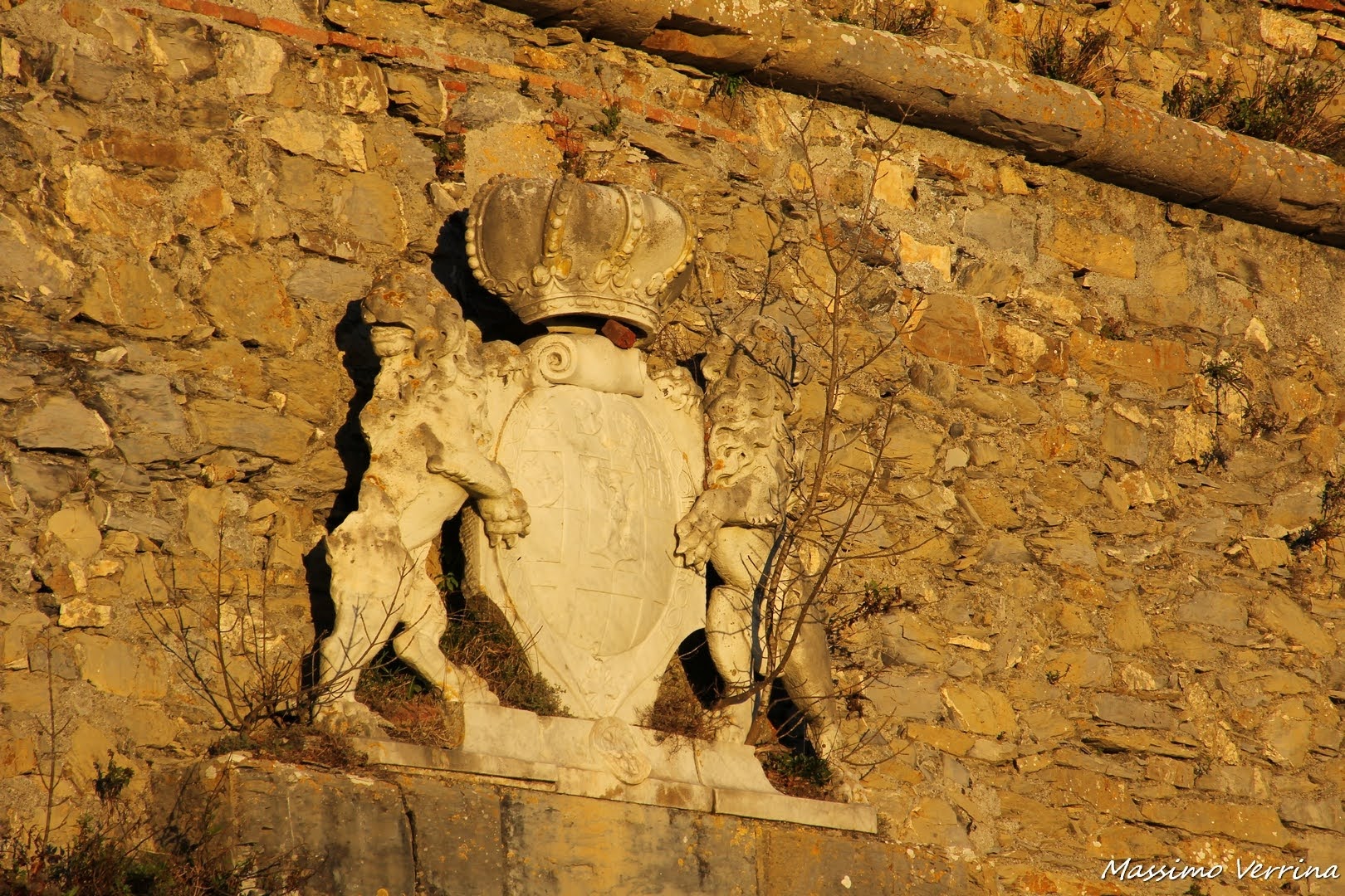 Sopra al portone principale, chiuso, c’è uno stemma ancora ben conservato. Col sole del pomeriggio risalta al meglio, ora ci avvicineremo al cancello per curiosare all’interno…