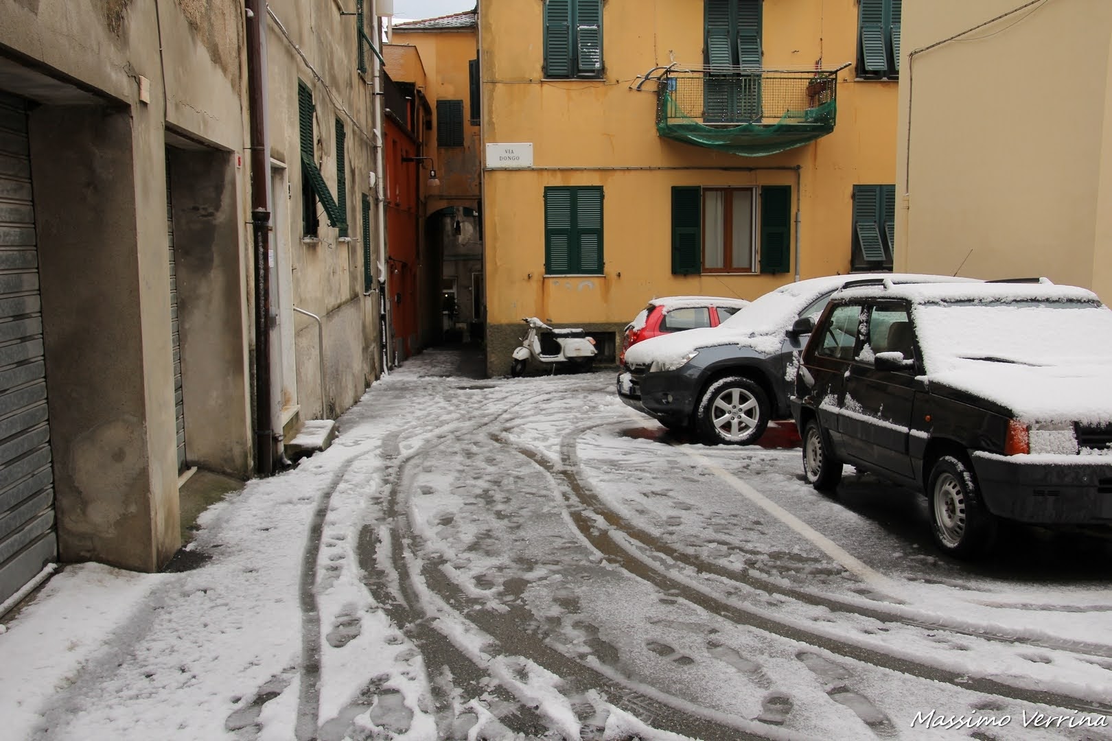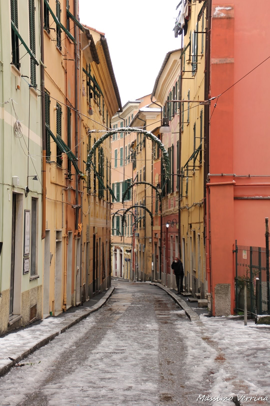 che bello i carruggi con la neve, uno spettacolo. Tutto cambia, tutto diventa silenzioso, misterioso.