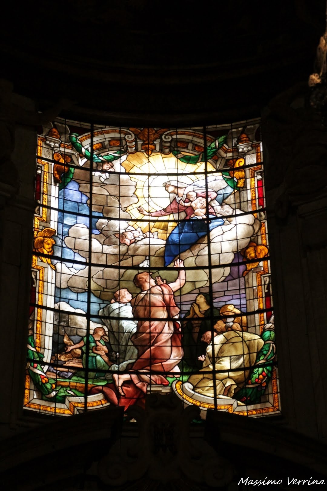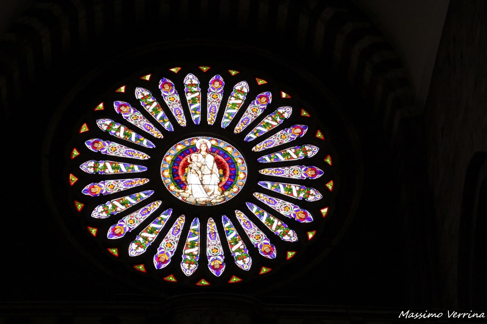 La grande e colorata vetrata posta in alto ci colpisce all’istante, volgiamo lo sguardo in alto e ci lasciamo avvolgere da quella luce intensa e da quelle figure che sembrano animarsi davanti a noi…