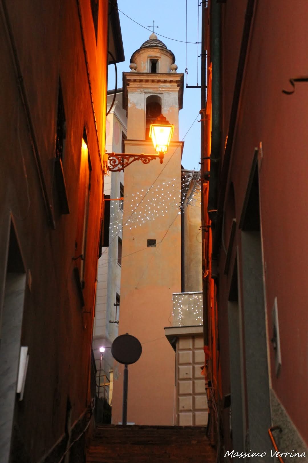 Mi sposto dal muretto, le luci della sera si cominciano ad accendere, la folla del pomeriggio si sfoltisce, cambiano i colori, il paesaggio si arricchisce di nuove prospettive. Si sentono i profumi dei vari negozi lungo la strada, la famosa focaccia ligure, il profumo del pane, e quello dei bar che preparano i primi aperitivi della sera….