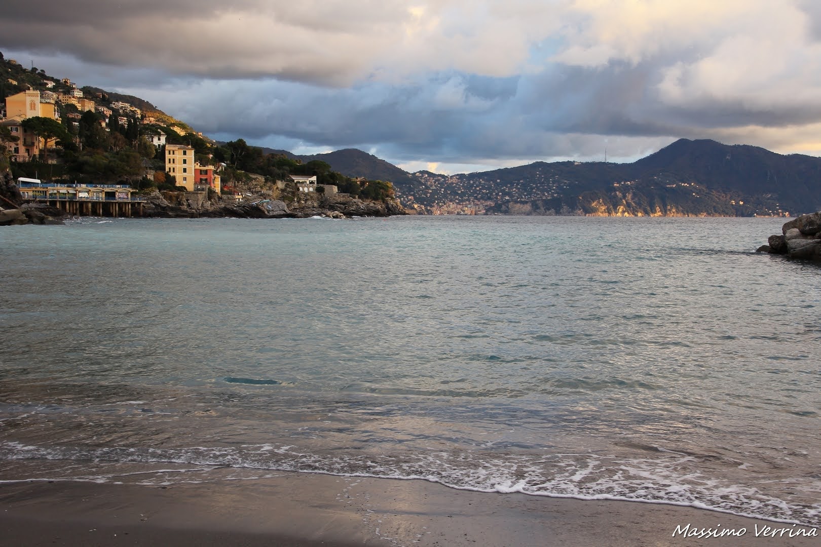 Mi volto dall’altro lato, col teleobiettivo ecco Camogli, di cui vi ho parlato fino a poco tempo fa. Qua la vediamo posata sul suo Promontorio, fra il canto dei gabbiani e quelle luci che sembrano scivolare verso il mare, giochi di colori in divenire, specchi di vita che danzano fra l’arsura dell’inverno…