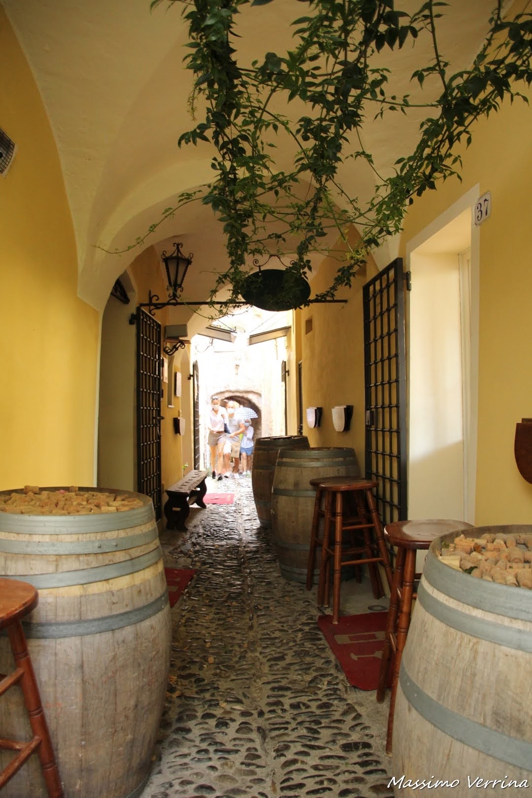 Attraverso un luogo molto particolare, in quel punto trovo un’enoteca. Fuori delle grosse botti con dei tappi sopra, sembravano decorare quell’angolo del borgo. Era davvero una situazione particolare, il profumo del mosto e di vari vini sembrava sprigionarsi nell’aria, fondendosi con quello delle varie spezie e della terra bagnata…