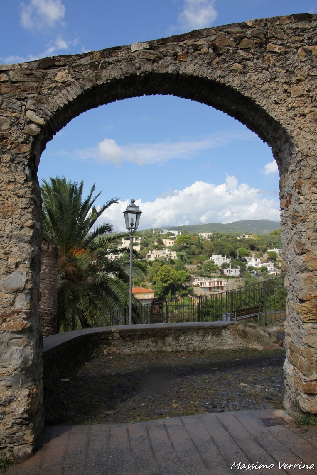 Finalmente smette di piovere, il sole ricomincia a scaldare, verso la parte alta del borgo trovo una porta storica che permette di accedere ad un punto panoramico e ad una sottostante strada. La campagna ligure col suo verde acceso dona una nota di colore e sembra riaccendere quella giornata estiva….