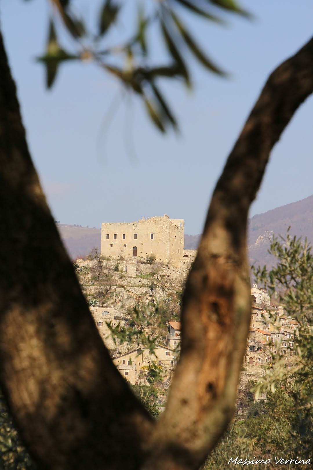 Sempre in tema di originalità, fra gli ulivi ecco un altro scatto particolare. Il Castello che vedrete meglio più avanti qua spunta da questa particolare immagine fra i rami. Un modo singolare per rendere speciale questo angolo di Liguria…
