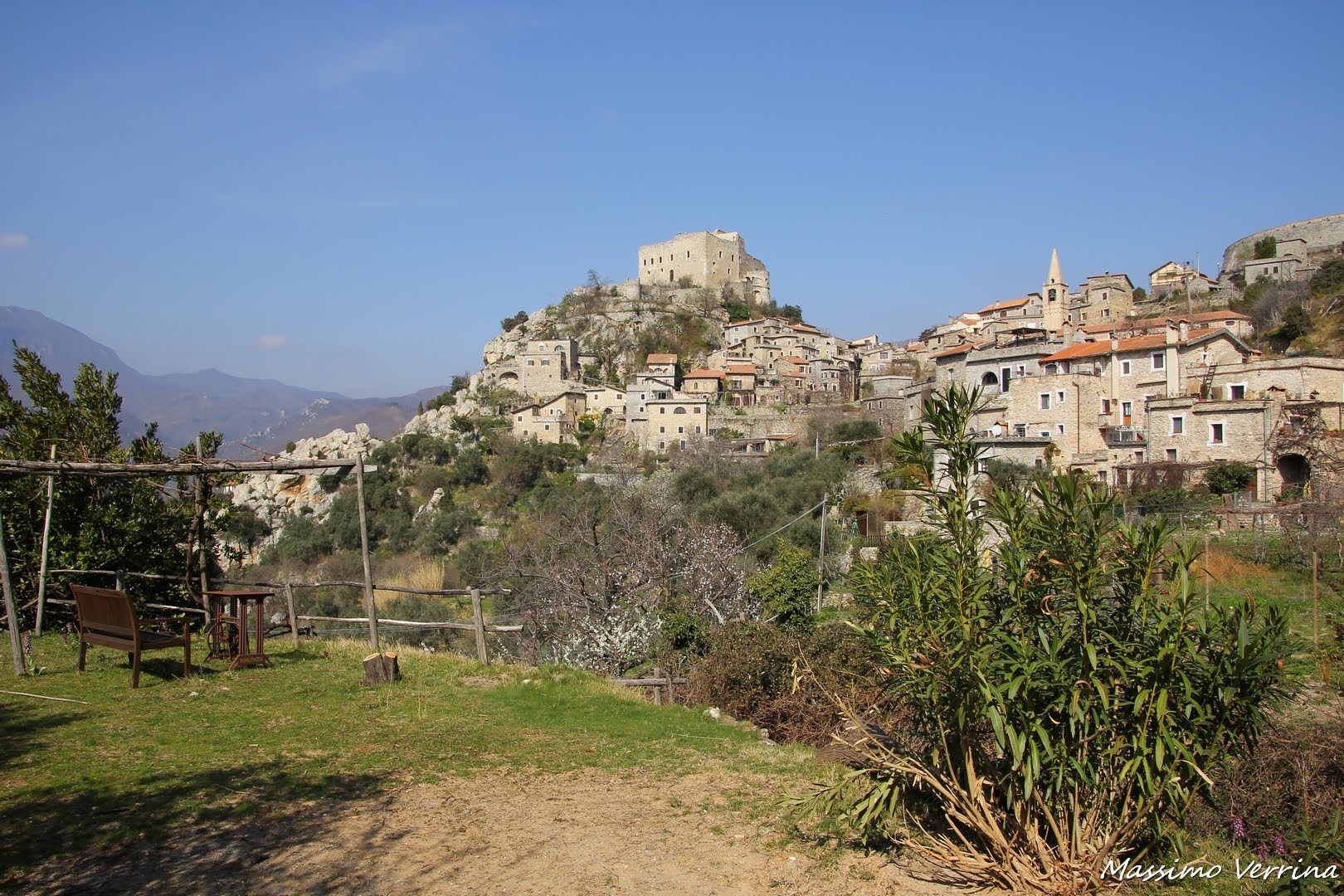 Ecco infatti lo scenario che si presenta al fortunato proprietario di questo terreno, un vero giardino affacciato sulla storia e sulla poesia di questa parte di Liguria. E con un po’ di fantasia per qualche attimo anche voi potete bearvi di questo magico angolo, grazie alla mia immagine…