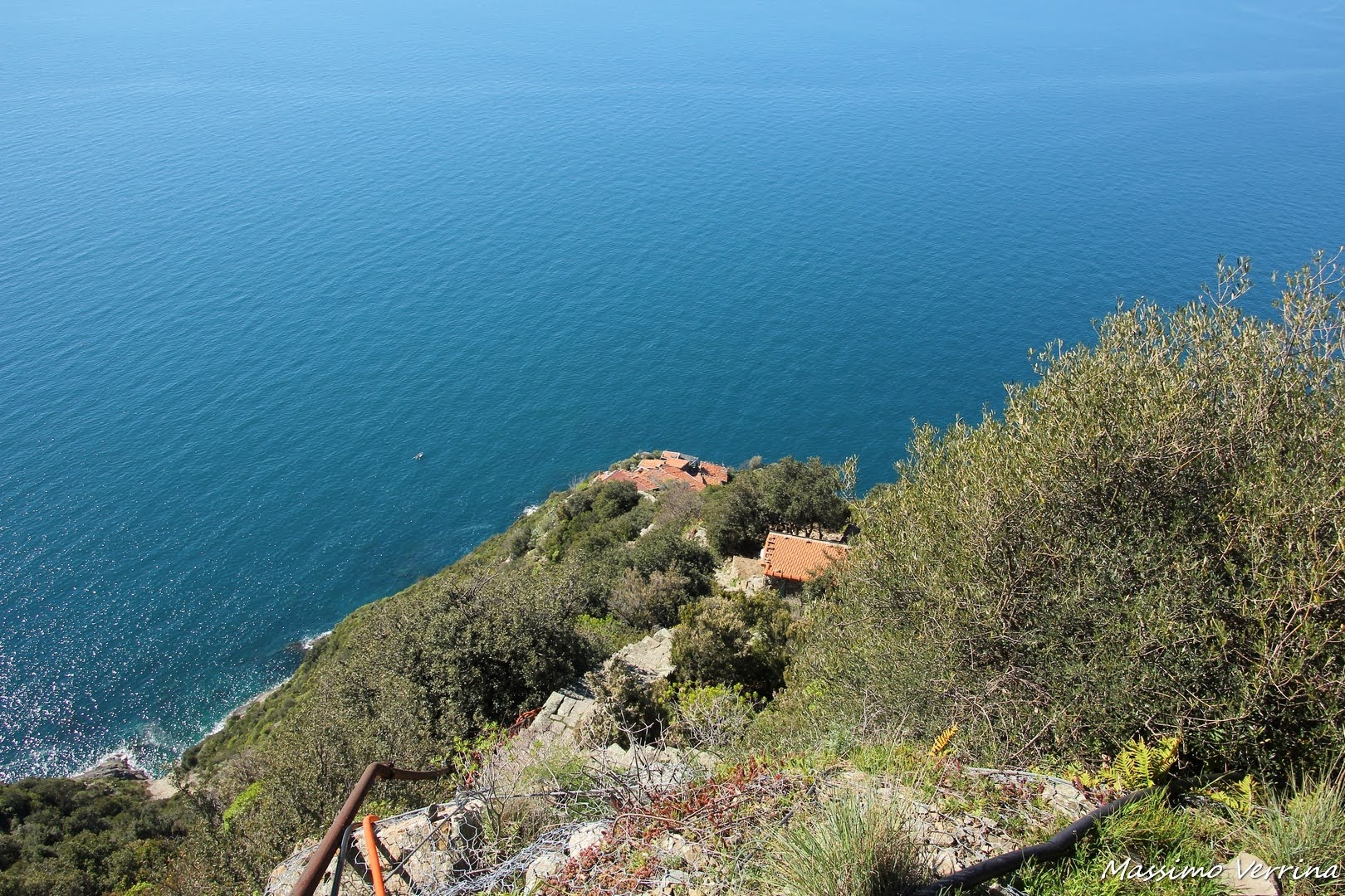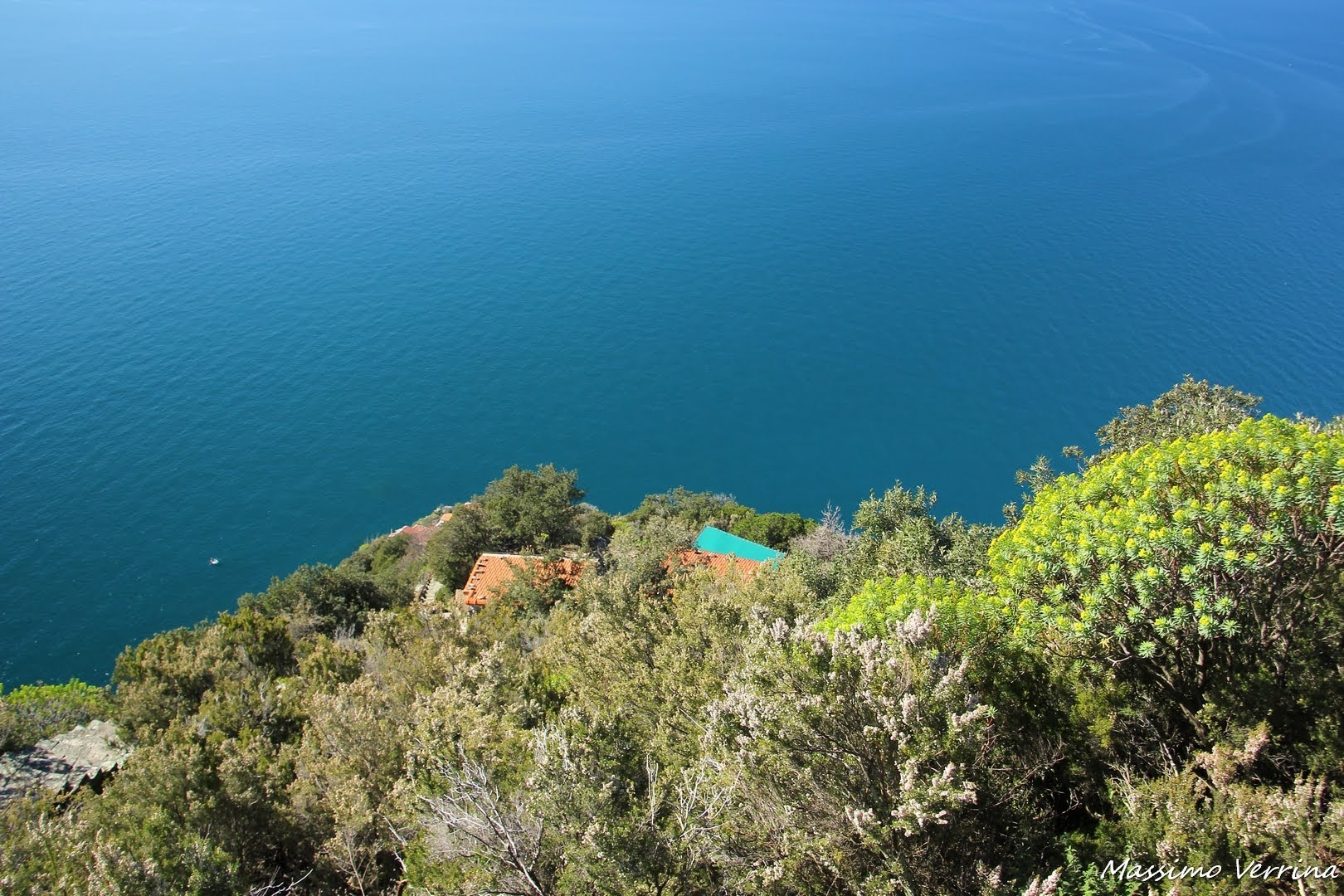 Col teleobiettivo dall’alto anche se siamo ancora molto lontani inquadro i tetti del piccolo e caratteristico nucleo di case di Monesteroli. Questo borgo che vedremo da vicino nei prossimi post è molto particolare, qua un tempo si vinificavano le uve raccolte nei vigneti qua attorno, poi il vino veniva trasportato fino in cima al monte con una fatica immensa. Oggi sono abitate solo poche case, a cui accedono via mare, ormai il nucleo ha una vocazione solo turistica..