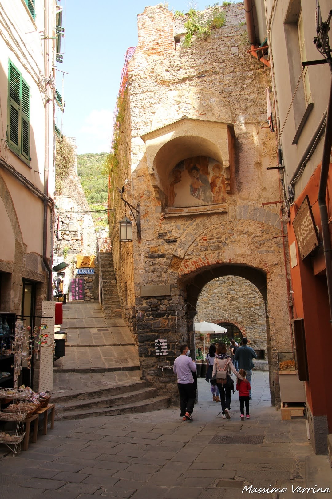 Al termine della contrada, o all’inizio se entrate dall’altra parte, troviamo questa bellissima porta storica che contribuisce a creare quell’atmosfera medioevale tanto amata da chi, come me, ama esplorare borghi antichi. Sulla sinistra la strada in salita è l’inizio di un lungo trekking verso la via alta delle 5 Terre. Lungo questo sentiero trovate anche il Castello visto nei primi post di questa narrazione…