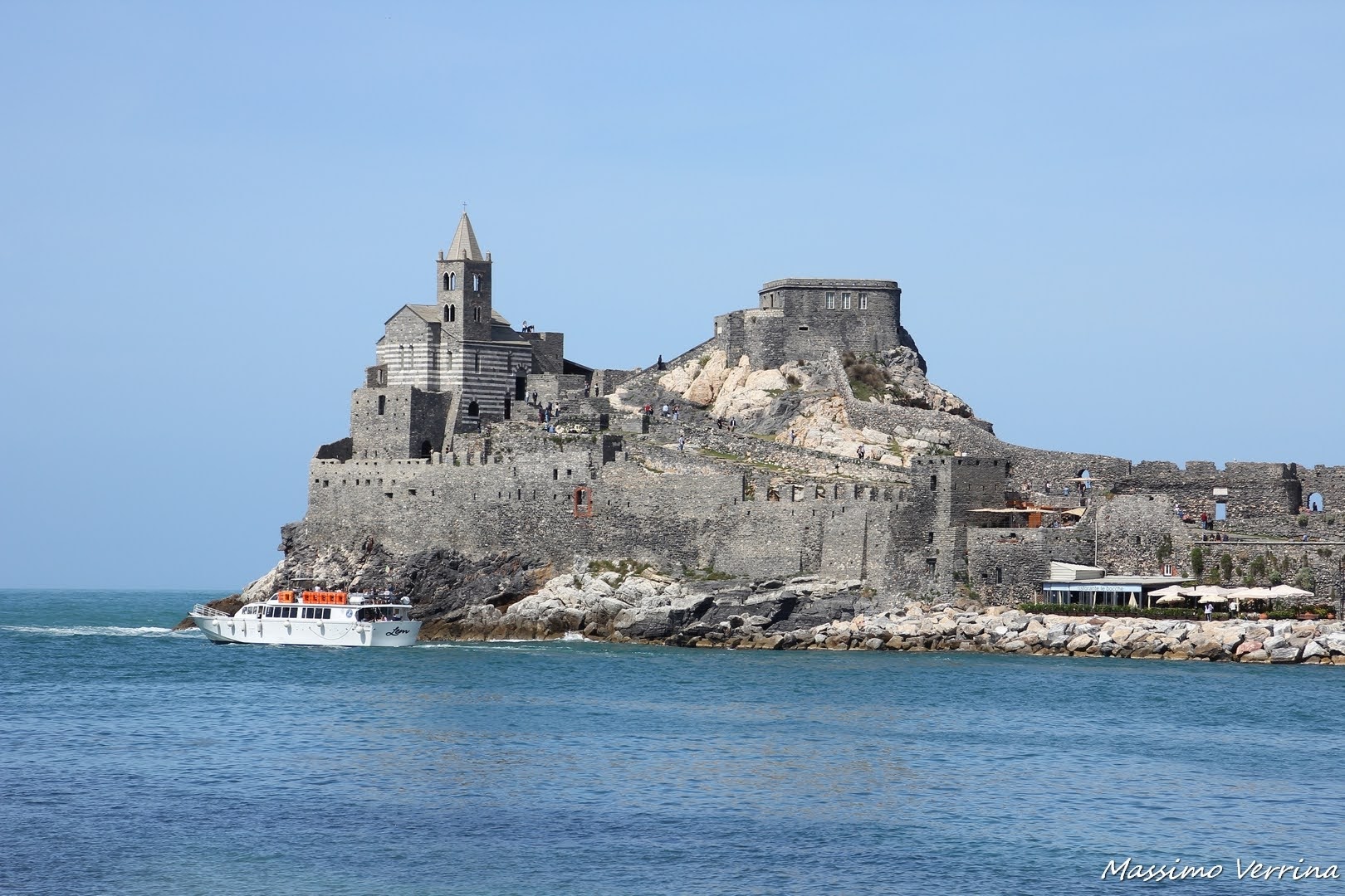 Ed ecco la chiesa di San Pietro che abbiamo visto prima come appare dal mare, dal centro del Canale. C’è anche una barca turistica che sta passando, questa è quella che fa il giro delle Isole e arriva alle 5 Terre. Se capitate in una giornata di mare molto mosso queste escursioni vengono sospese, con le mareggiate non navigano per questioni di sicurezza…