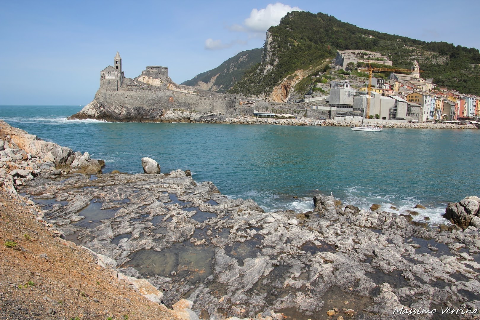 Il primo tratto di sentiero come avete visto corre parallelo alla costa di Portovenere, quindi gli scatti di questa prima parte, anche se ci troviamo sull’isola sono ancora indirizzati verso Portovenere. Ecco un altro bel particolare delle sue case colorate, di una delle torri, e del suo verde che la circonda avvolgendola di poesia…