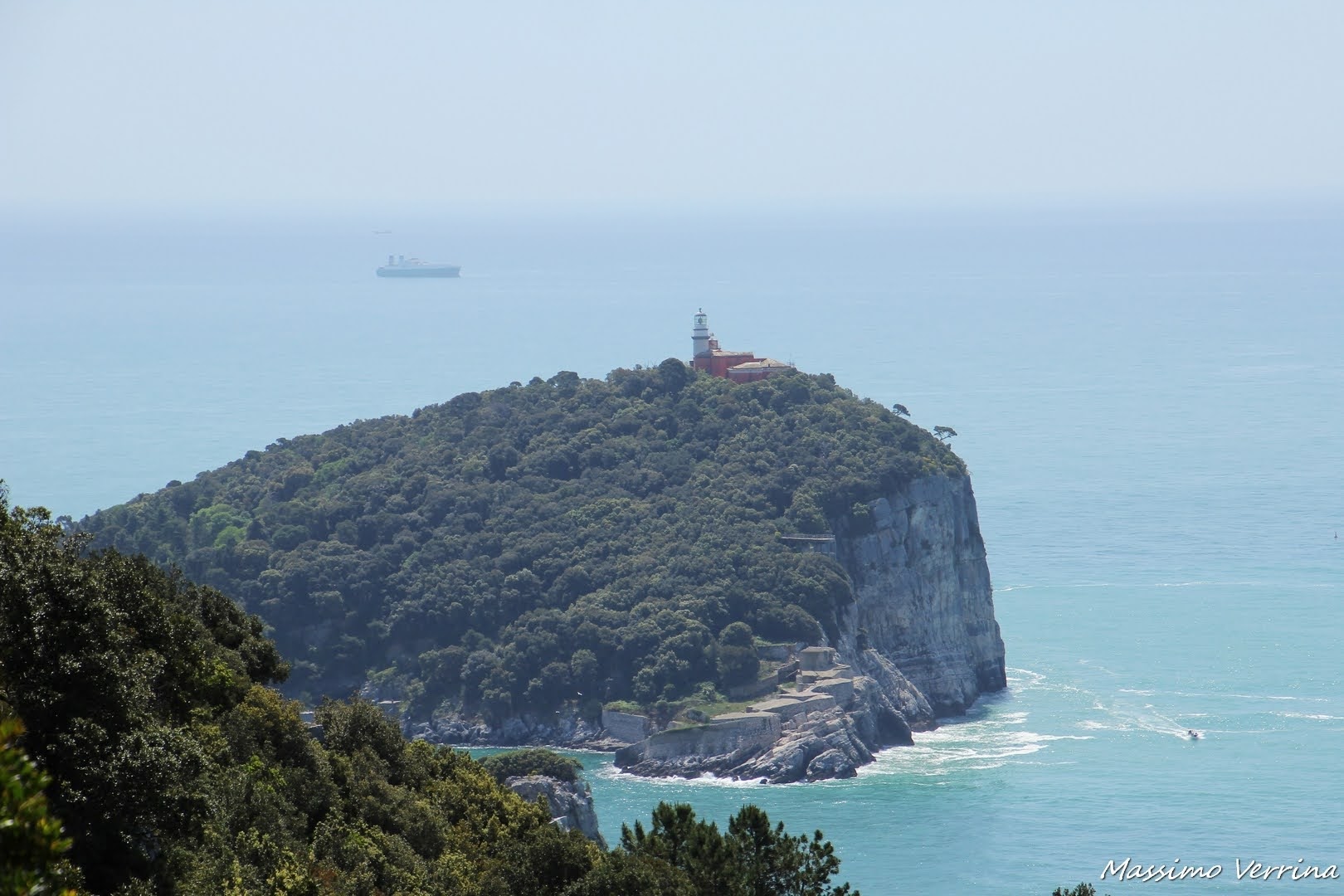 Ci troviamo nella parte più alta dell’isola, da qua riusciamo a scorgere anche il golfo di La Spezia, sotto, nascosta in parte dalla vegetazione, spunta la baia di Portovenere, che vedrete molto bene nel tratto finale…