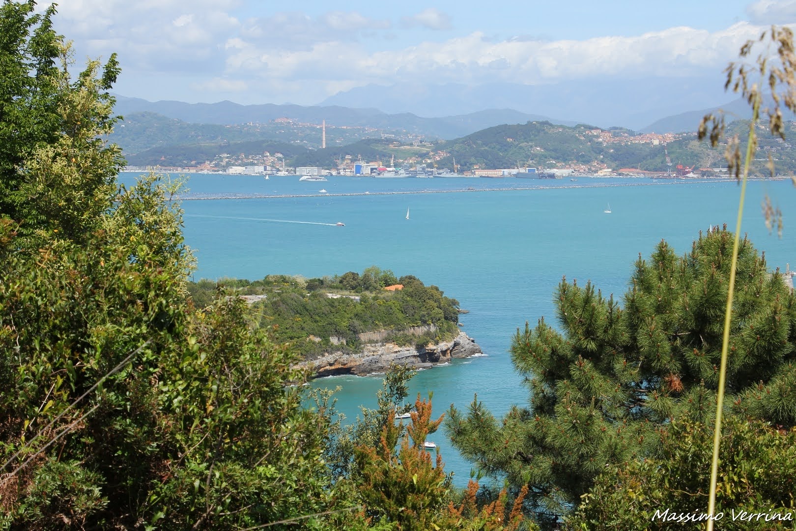 Stiamo voltando per entrare nell’ultimo tratto di percorso che ci riporterà da dove siamo partiti, ecco il vasto porto di La Spezia sullo sfondo, le Alpi Apuane, e il piccolo promontorio che segna la parte più orientale dell’isola Palmaria. Fra poco vedremo la piccola isoletta faro vista nei primi post di Portovenere….