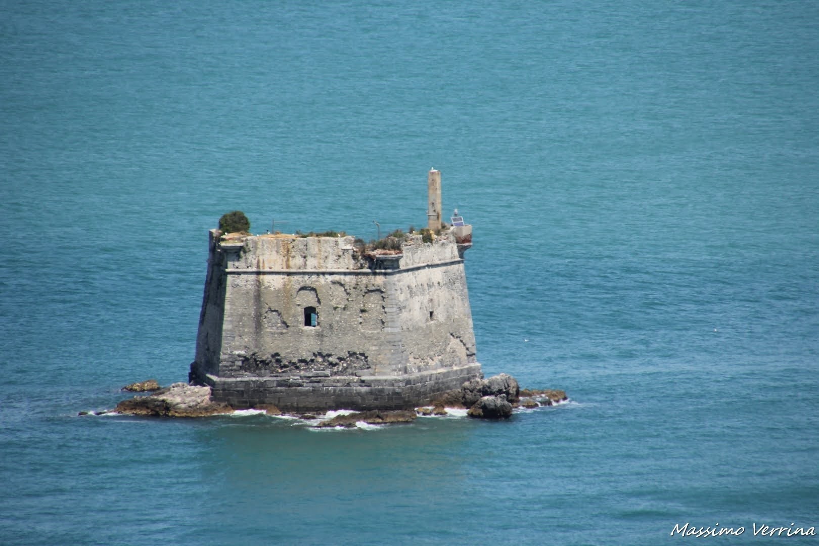Ecco a voi la Torre della Scuola, un faro posto a 243 metri dall’isola, davanti al Terrizzo, che è il promontorio che abbiamo visto sopra. E’ utile alle navi che devono entrare nella baia di la Spezia. Visto da qua ha un fascino tutto particolare, ma solo perché lo vedete attraverso i miei mezzi, se camminaste qua ad occhio nudo lo vedreste lontanissimo…