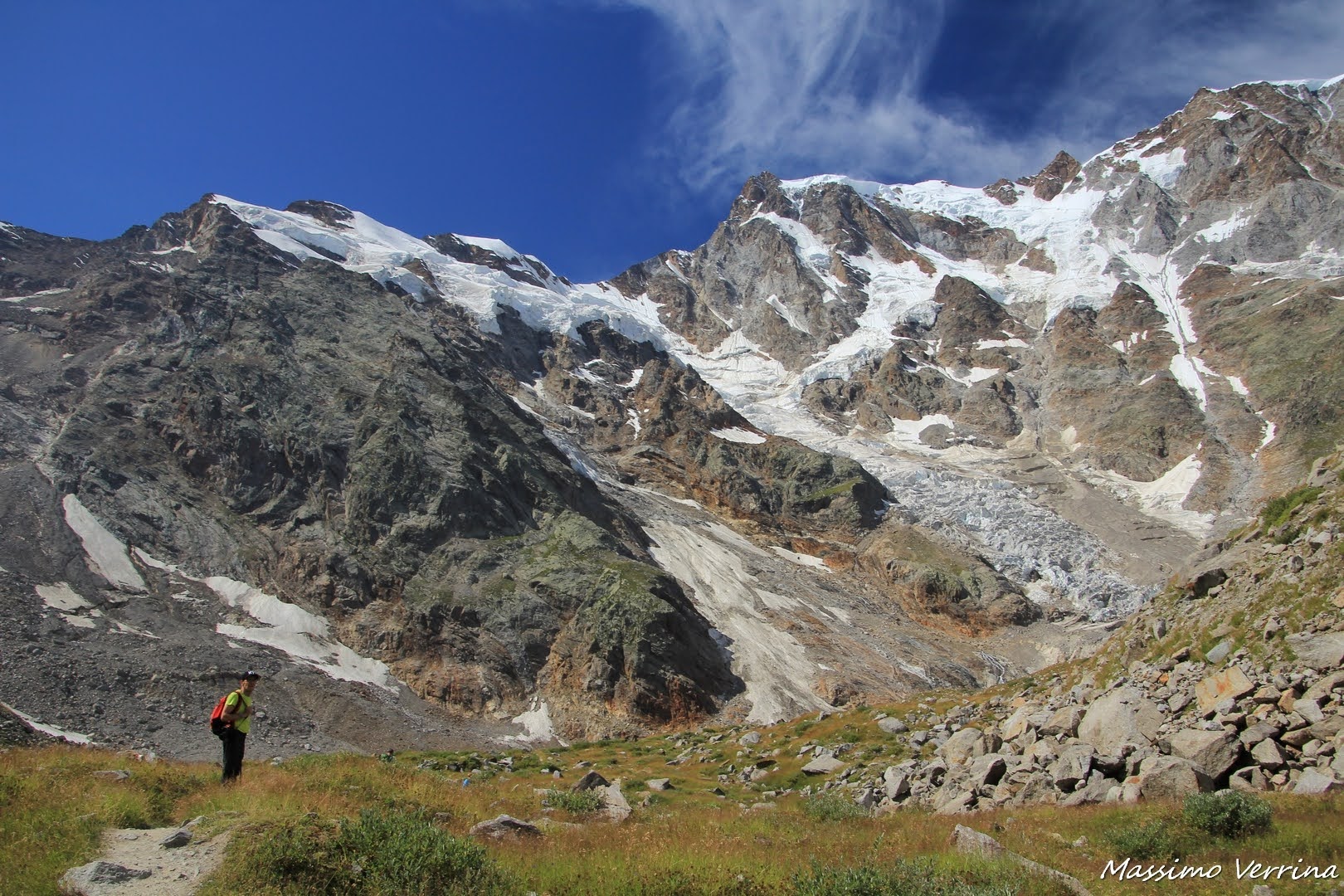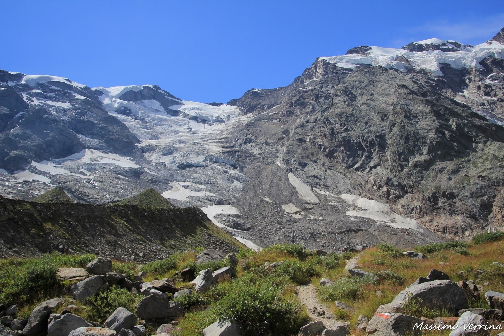 Dopo la dura salita ecco un piccolo pianoro che preannuncia lo spettacolo che vedrete a breve. In questo punto si sentivano dei cupi rombi, sembravano tuoni, seguiti da un crepitio di pietre. Era il ghiacciaio che si stava spaccando per il caldo delle ore centrali del giorno sulle pareti di fronte a noi…