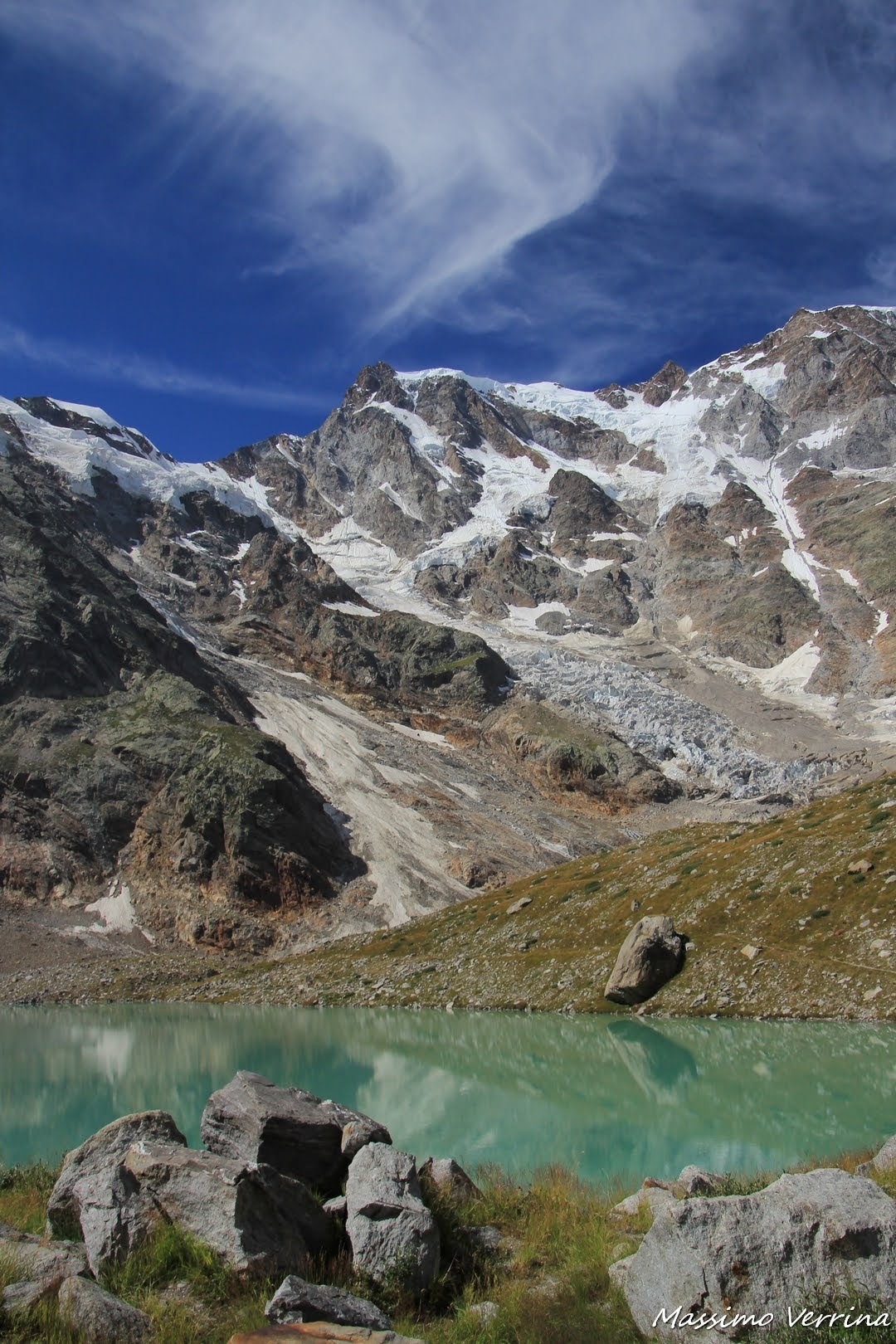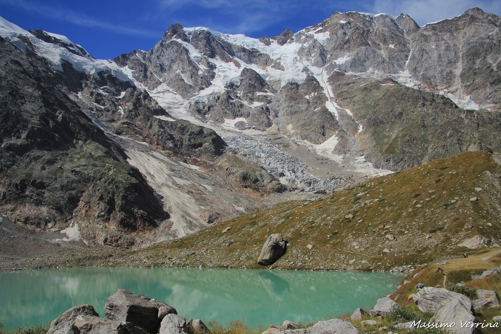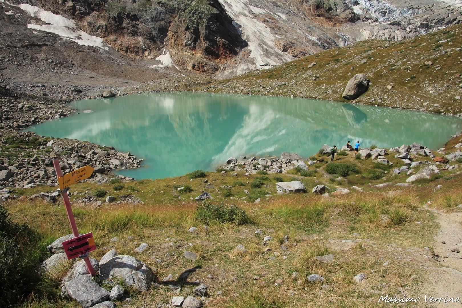 Per il mio pranzo al sacco non potevo trovare una collocazione migliore, l’aria fresca dell’alta quota mi faceva davvero piacere, con tutto il caldo preso a salire ci voleva proprio questa fresca pausa. Erano molti gli escursionisti fermi sulle sue sponde quel giorno, il loro vociare si confondeva con i sordi rombi del ghiacciaio e col rotolamento delle grosse pietre sulle pareti di fronte a noi….