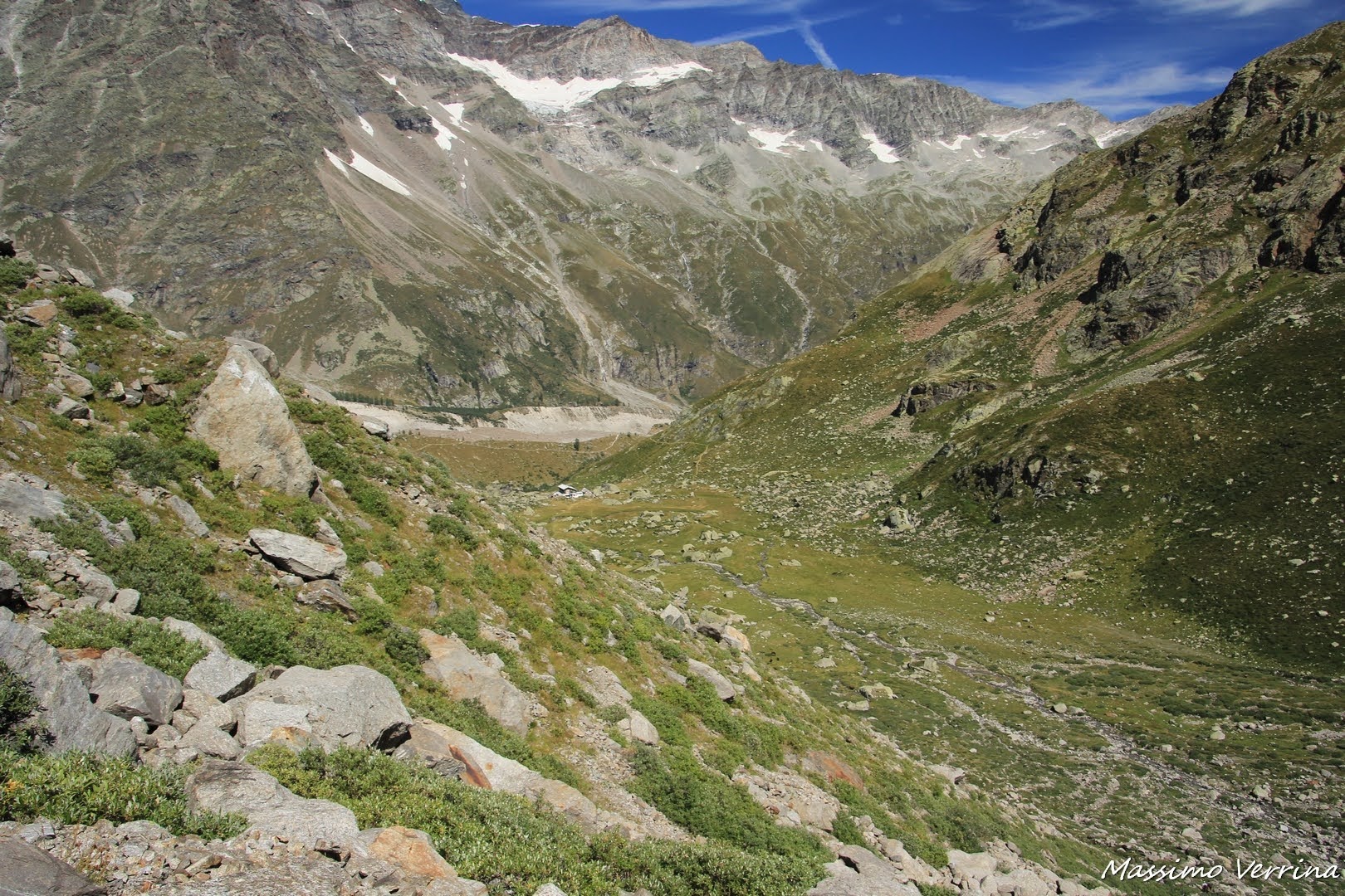 Finito di ammirare il lago e i ghiacciai, non mi rimaneva che scendere a valle. La ripida discesa vista prima del punto d’inizio sembrava un salto nel vuoto, inizia dopo quelle rocce scure che vedete sullo sfondo….