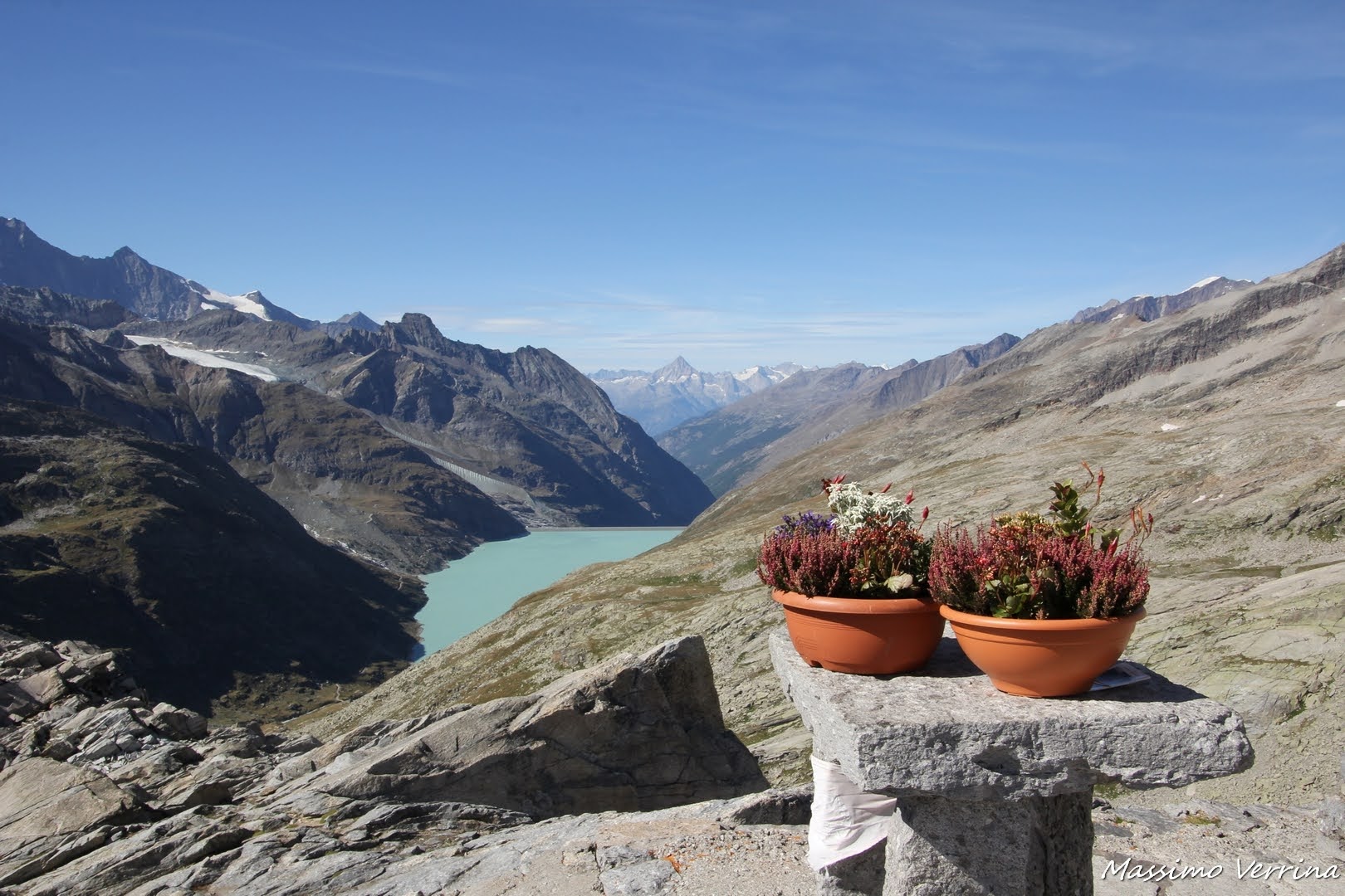 Ma per concludere questo viaggio sul Monte Moro, ho scelto un po’ di gioia, e perché no, un po’ di romanticismo. Ecco due bei vasetti di piante posizionati su un ceppo, subito accanto alla Statua della Madonna che avete visto prima. In questa prima immagine ve li mostro con lo sfondo del bellissimo lago turchese….