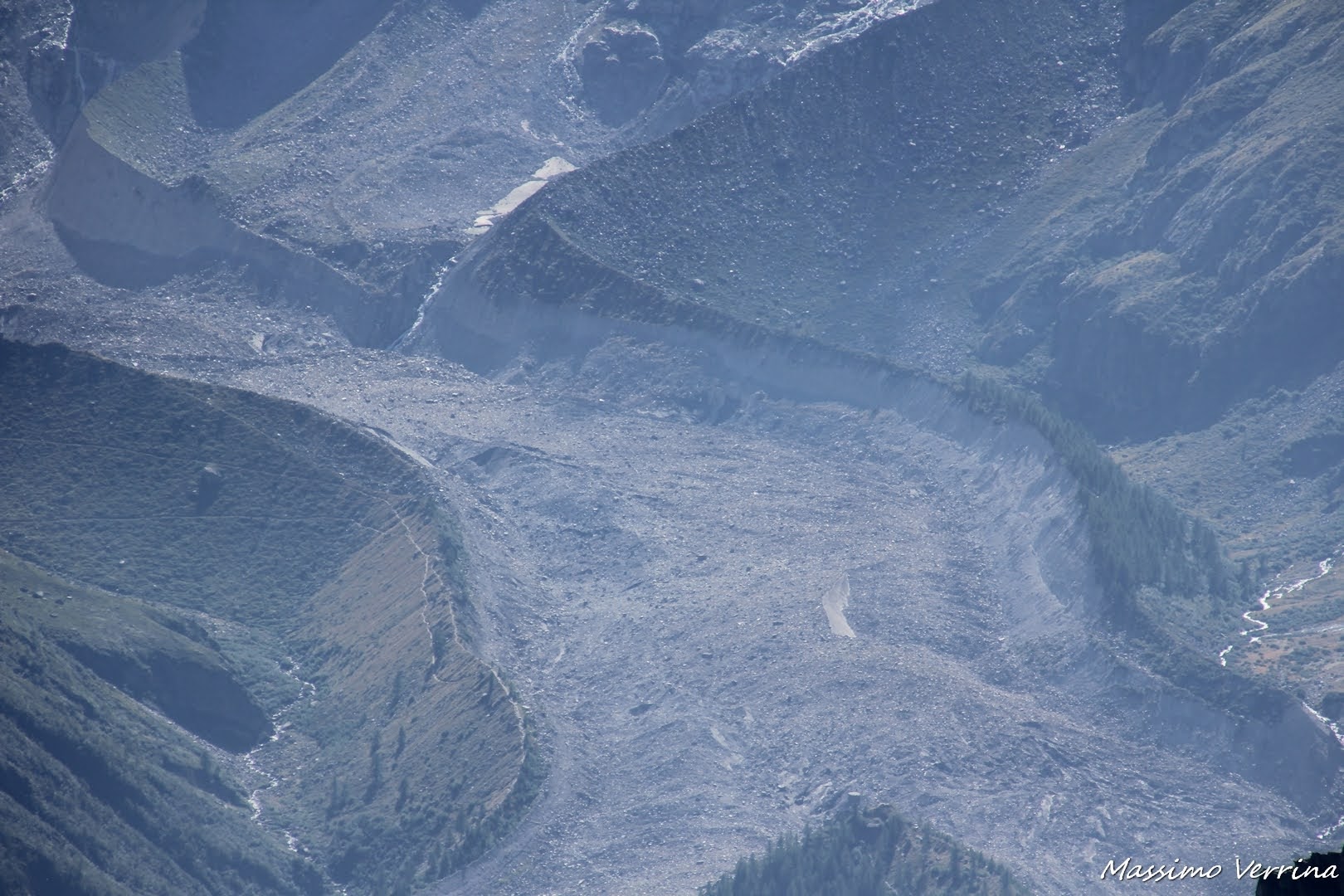Il grande ghiacciaio del Monte Rosa, osservato nel suo insieme da questo nuovo punto di vista, rende benissimo l’idea di quello che ho appena scritto. Pensate che un tempo quella valle era tutta di ghiaccio, da una sponda all’altra, e come un immenso fiume raggiungeva le quote più basse della vallata. Ora sono solo rocce disintegrate, che rotolano a valle con rumori inquietanti. Sotto di esse, quel che resta del ghiacciaio, si trasforma in torrenti sempre più impetuosi..