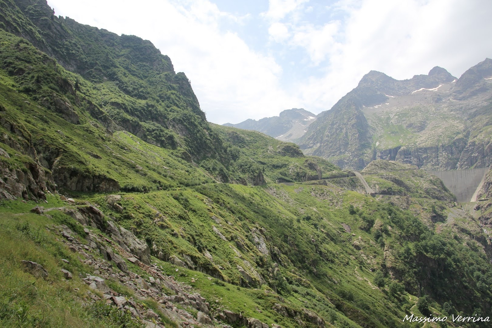 Con la prospettiva paesaggistica della prossima immagine potete vedere molto bene il canalone scavato dall’acqua che esce dalla diga, si vede anche l’ultima neve sulle vette più alte e l’imponente muraglione della diga…