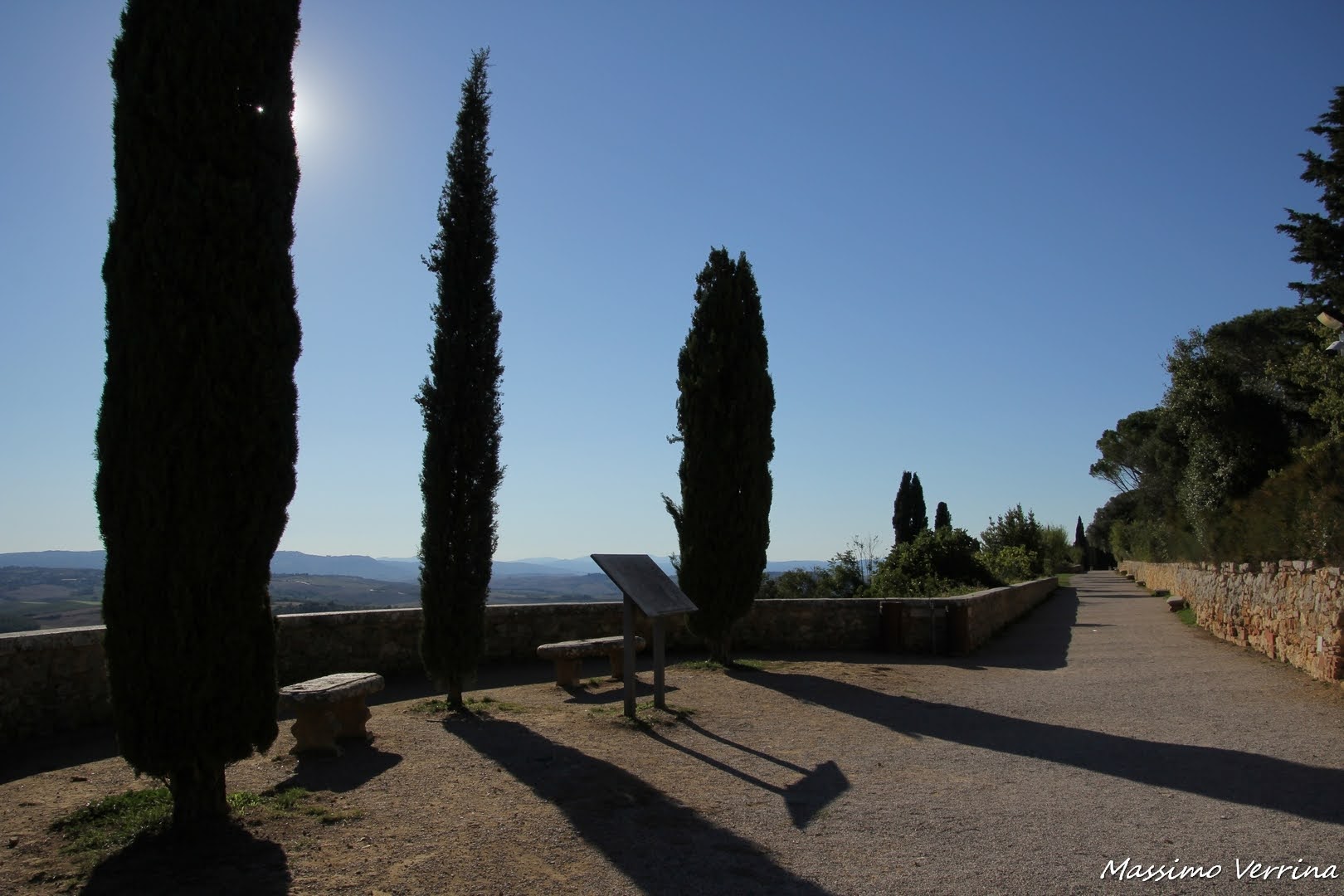 Mi sposto fuori dal centro, ecco uno spazio bellissimo, una via che sembra un parco affacciata sul paesaggio toscano. Due ragazze parlano fra loro, la meraviglia della loro bellezza si compenetra con quella del paesaggio, è un attimo di vera poesia, una gemma di femminilità in una sorgente di vita…