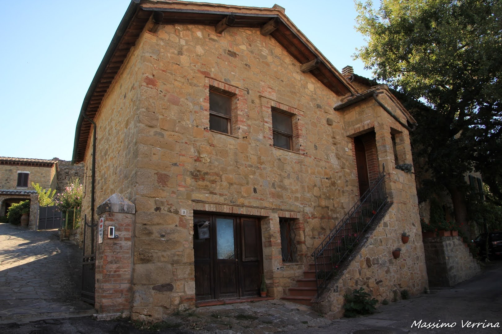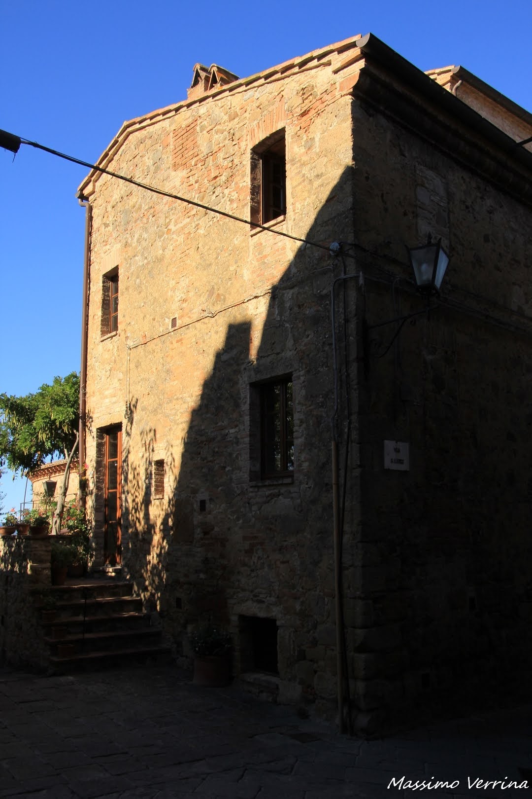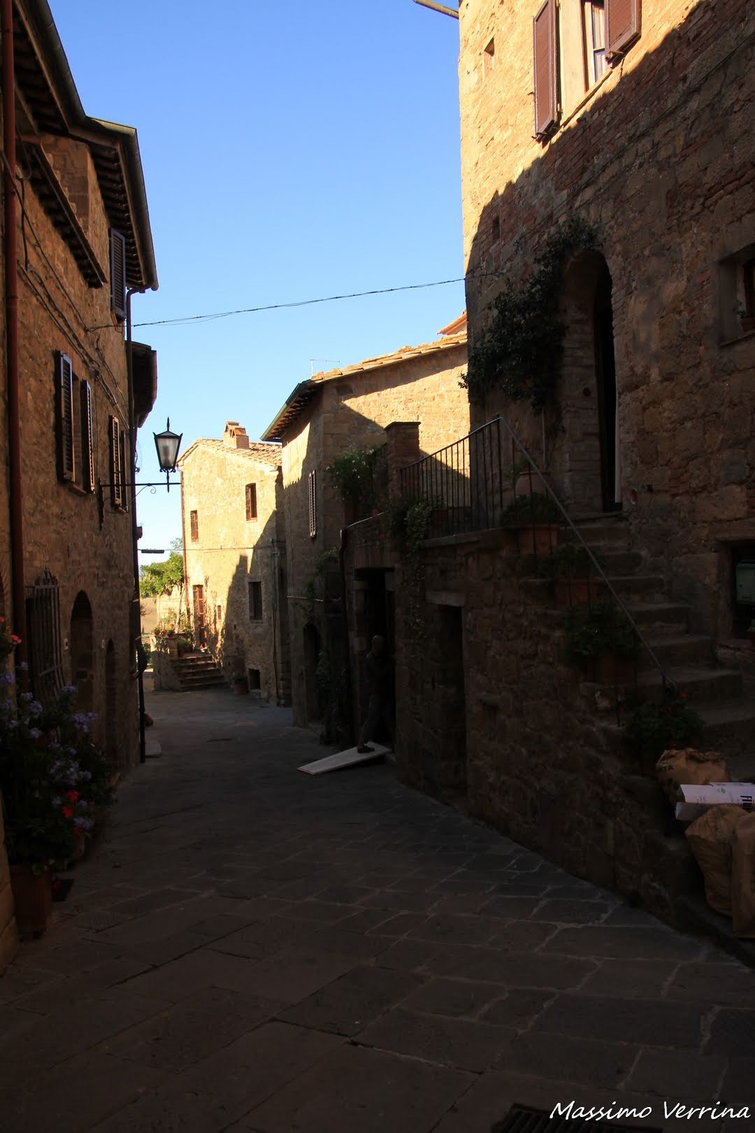 In una casa nell’ombra più netta di una via stavano eseguendo dei lavori, una tavola permetteva di portare il materiale all’esterno con la carriola. Il rumore delle mazzette e il vociare degli operai all’interno riportavano alla realtà di tutti i giorni, sospendendo solo per qualche attimo l’atmosfera raccolta del piccolo borgo….