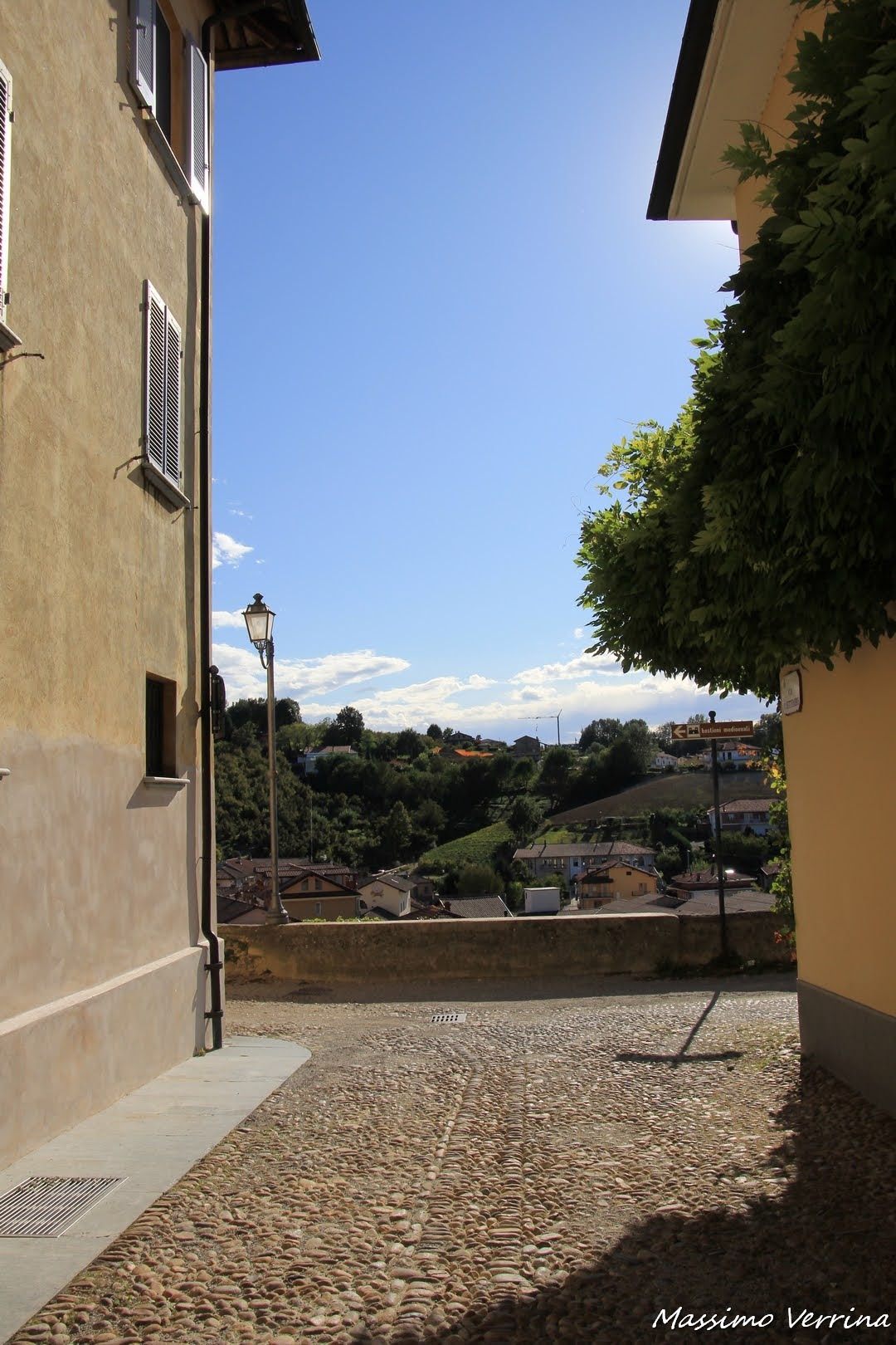 Alla fine di quella via ecco un cartello turistico che c’invita a proseguire per i bastioni medioevali. La campagna davanti a noi ci accoglie con l’alternarsi di vigne e case sparse nel verde delle colline. In lontananza i rombi di alcune moto che stavano per transitare nella via sottostante rompono il silenzio di quell’angolo di relax…