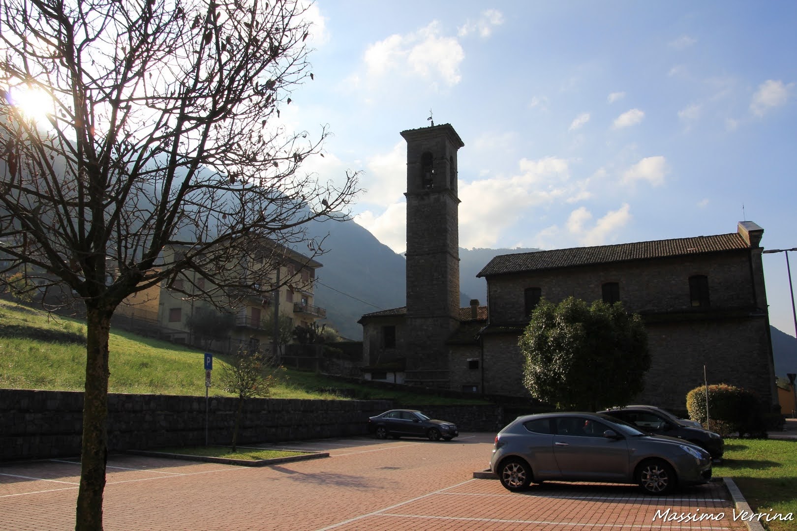 Eccoci pronti, con questa lunga narrazione vi farò fare tutto l’anello completo del Lago, percorreremo a piedi 17 km fra paesaggi mozzafiato e attimi di grande poesia! Questa gita è di ieri, quindi leggete quasi in tempo reale le sensazioni di questo paesaggio. Partiamo dal posteggio, dove una curiosa chiesa faceva da sfondo alla luce autunnale che sbucava dai monti….