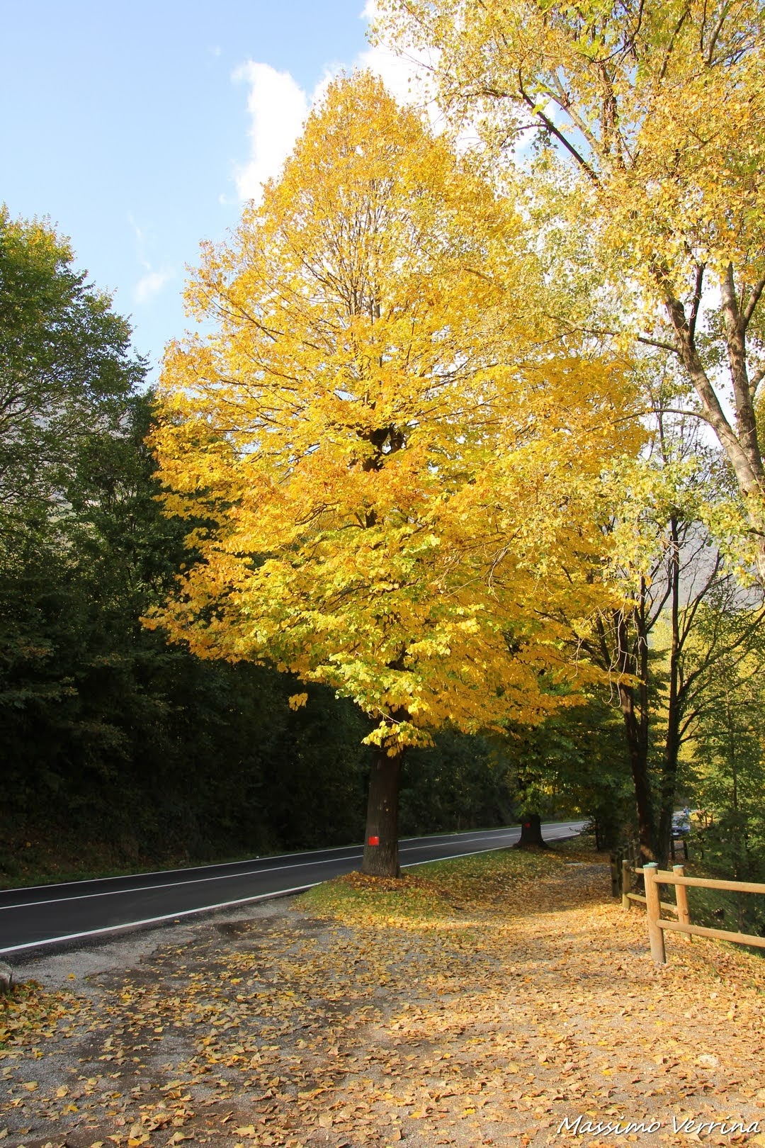 Attendo un attimo in cui non passino macchine per farvi vedere la meraviglia di quest’albero coloratissimo, un colpo d’occhio bellissimo! Le macchine in transito avrebbero sporcato la bellezza di questo spazio naturale, così è più coinvolgente e soprattutto diventa l’unico protagonista della scena….