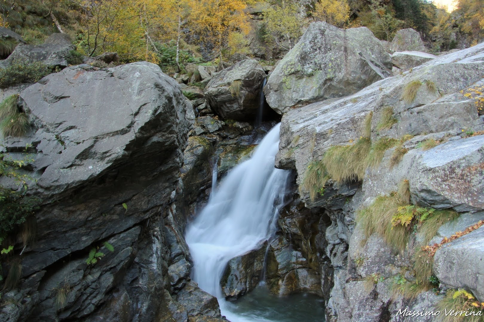 Qua mi trovo nel punto più in ombra del lago, da lì si osserva lo scenario sotto altre prospettive, dietro a me la cascatella faceva salire freddissimi spruzzi d’acqua. Sullo sfondo il colore maturo dell’autunno creava effetti scenografici di rara bellezza…