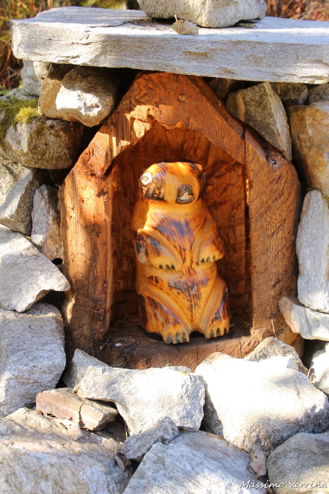 belle le sculture scoperte da Max il fotografo poeta! i luoghi della montagna sono sempre costellati delle loro casette di pietra e la lavorazione del legno…sicuramente case di vacanza dove gli abitanti si divertono a scolpire! I colori dell’autunno sono sempre molto romantici, compreso il colore del lago!..Buona serata Max!