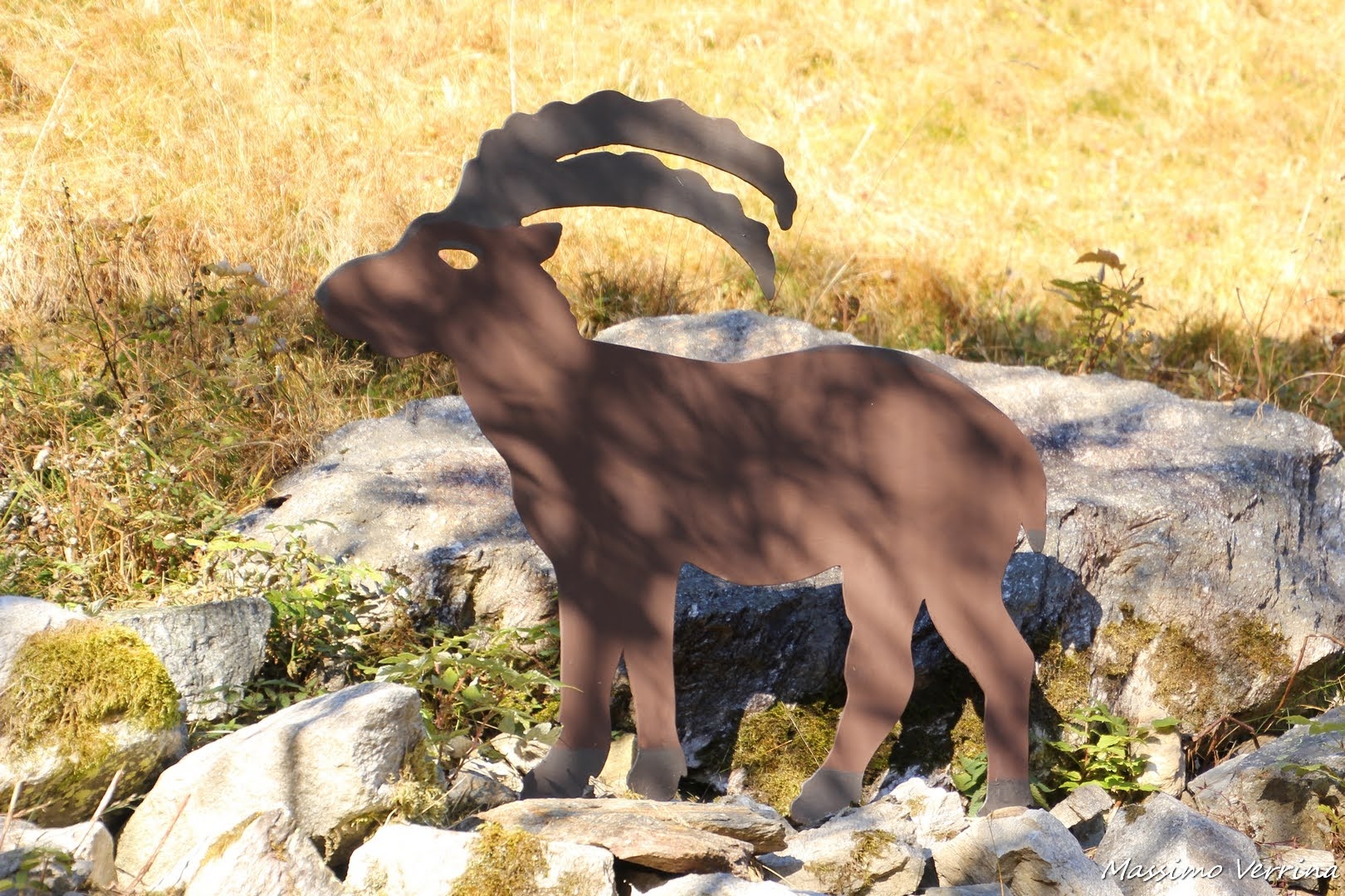 A poca distanza ecco la sagoma di uno stambecco, è così ben fatta e ad altezza naturale che se uno non ci pensa al primo colpo d’occhio sembra vero. Proprio una bella idea questa, sono riusciti ad arricchire questo sentiero, che diventa a tutti gli effetti ricco di sorprese…