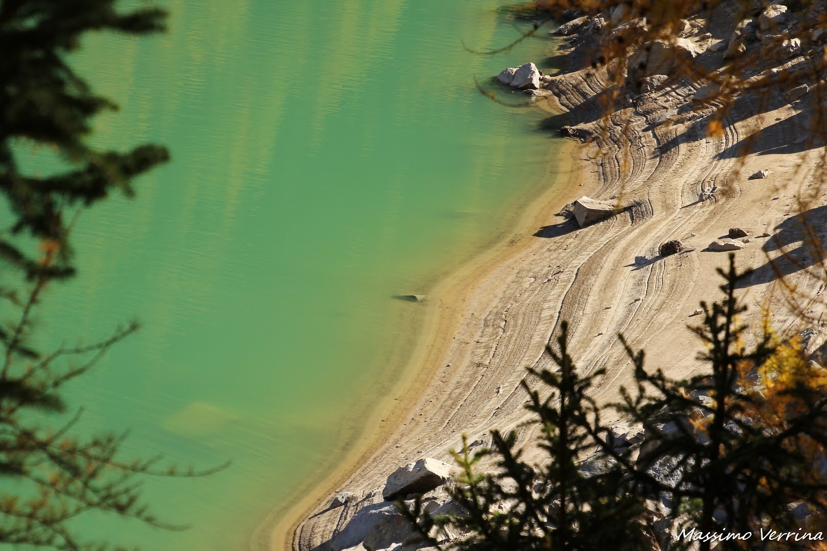 L’acqua del lago più bassa in alcuni punti ha lasciato delle tracce che se osservate con l’occhio di chi ama la fotografia possono trasformarsi in paesaggi surreali, come nel caso della prossima immagine. Qualcuno potrebbe vederci una costa tropicale, qualcun altro un paesaggio tipico dei canyon americani, in ogni caso la vostra fantasia è libera di correre dove vuole….