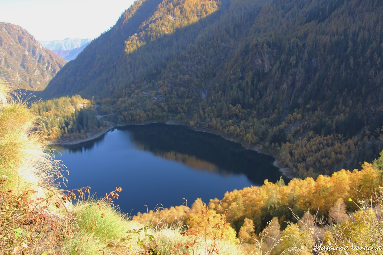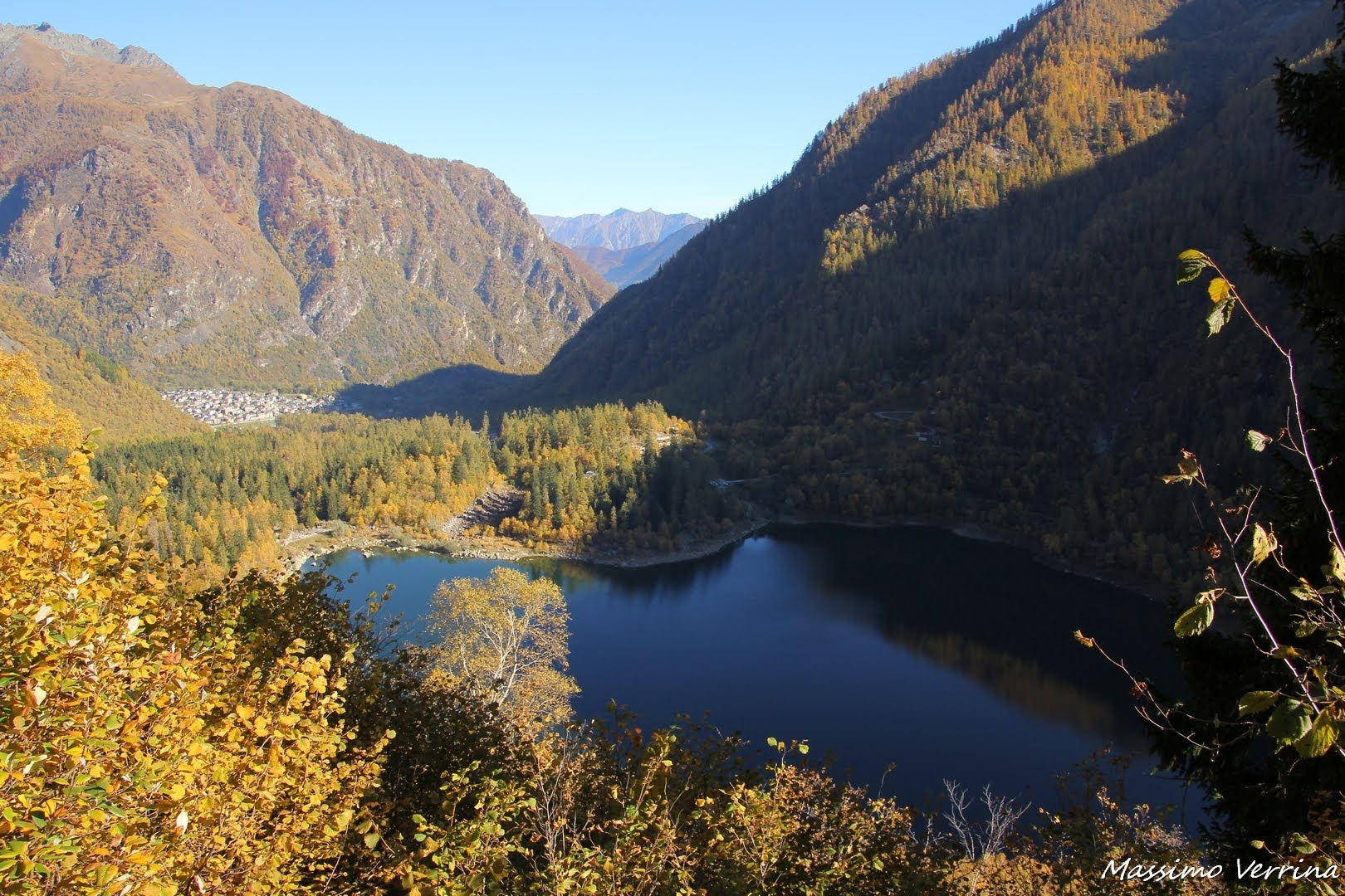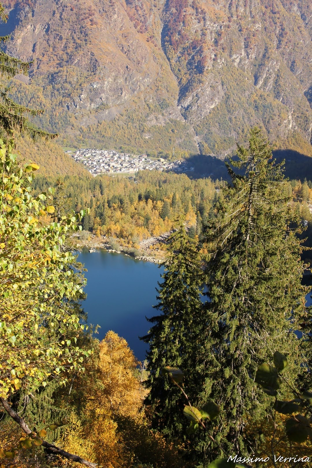 Il prossimo scatto che vi presento è molto particolare, in un solo clic ho abbracciato l’intero paesaggio della valle, in alto le montagne colorate d’autunno, al centro il borgo appena visto che da questa prospettiva assume una particolare forma a cuore, e in basso ecco il Lago di Antrona, dal quale siamo partiti e dove torneremo per chiudere l’anello….