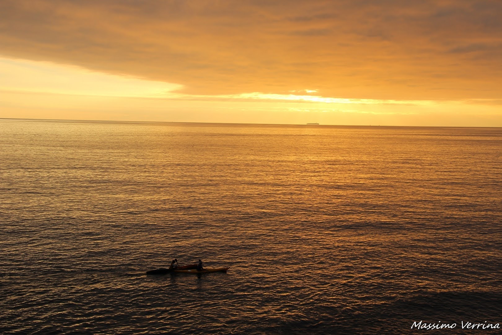 Il cielo e cupo e tenebroso, due canoe solcano il mare, l’immensità dello stesso le fa apparire due puntini nell’infinito. La luce straordinaria creata dalle nubi e dal sole conferisce un’atmosfera molto particolare….