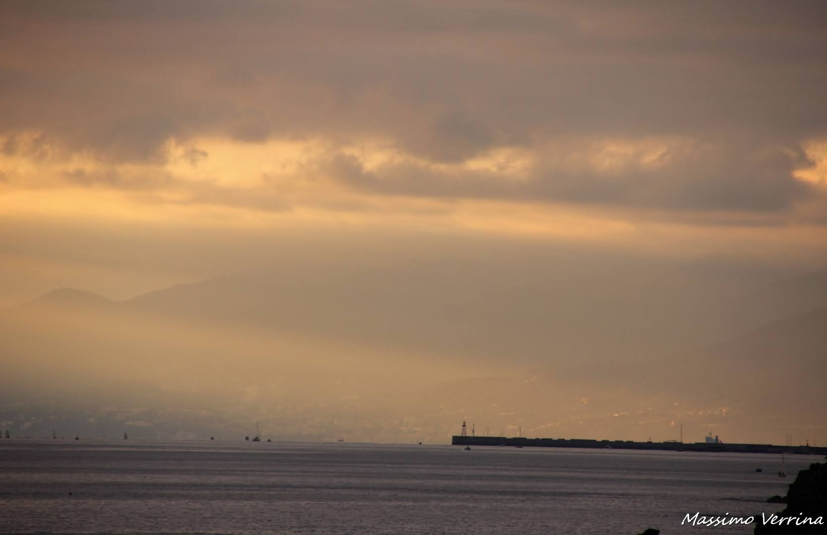Col potente teleobiettivo ecco la Riviera di Ponente, la diga del porto di Genova e le montagne che stanno dietro a casa mia, che più volte vi ho descritto nelle lunghe escursioni estive. Qua le luci sono protagoniste, una scenografia degna dei migliori film….
