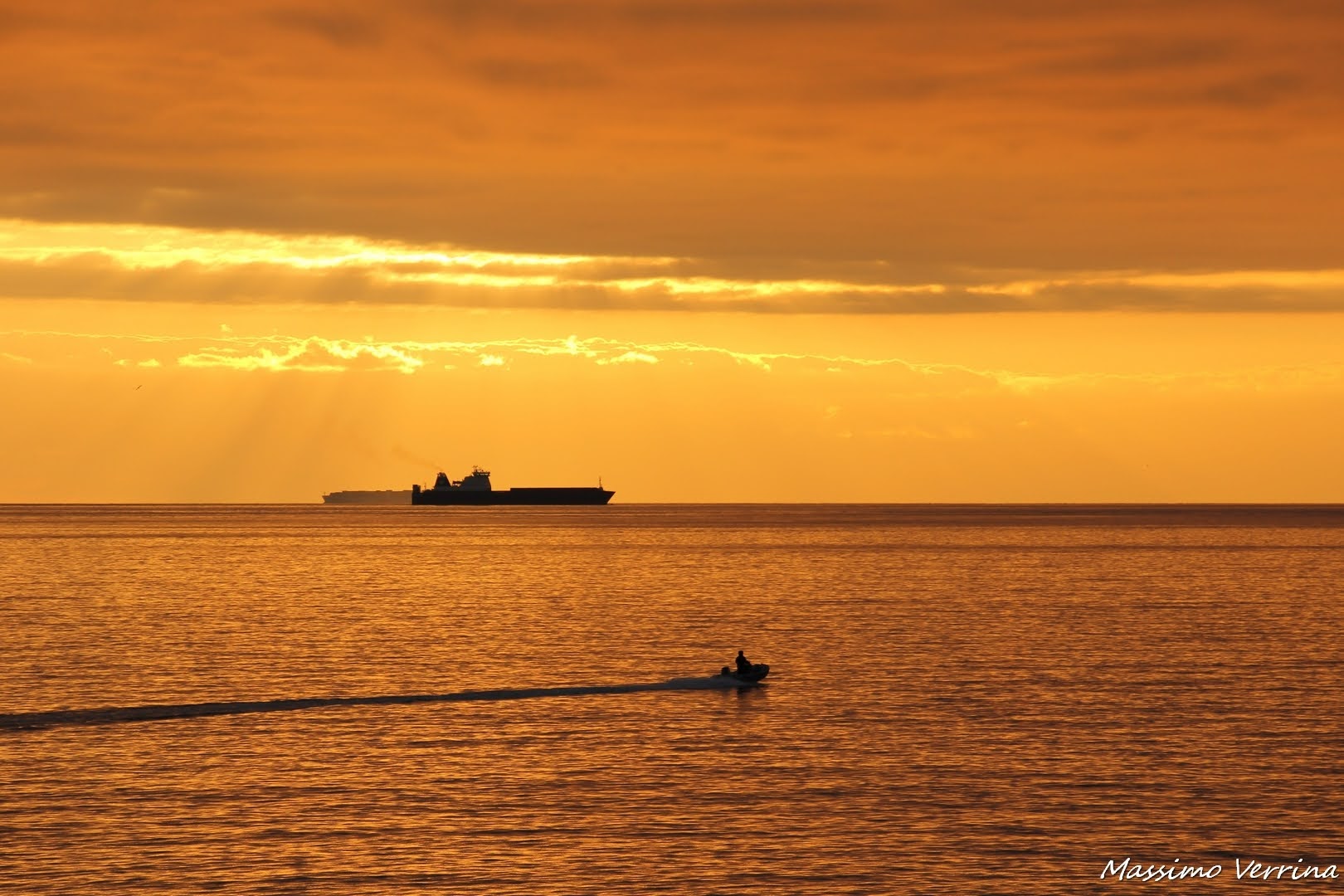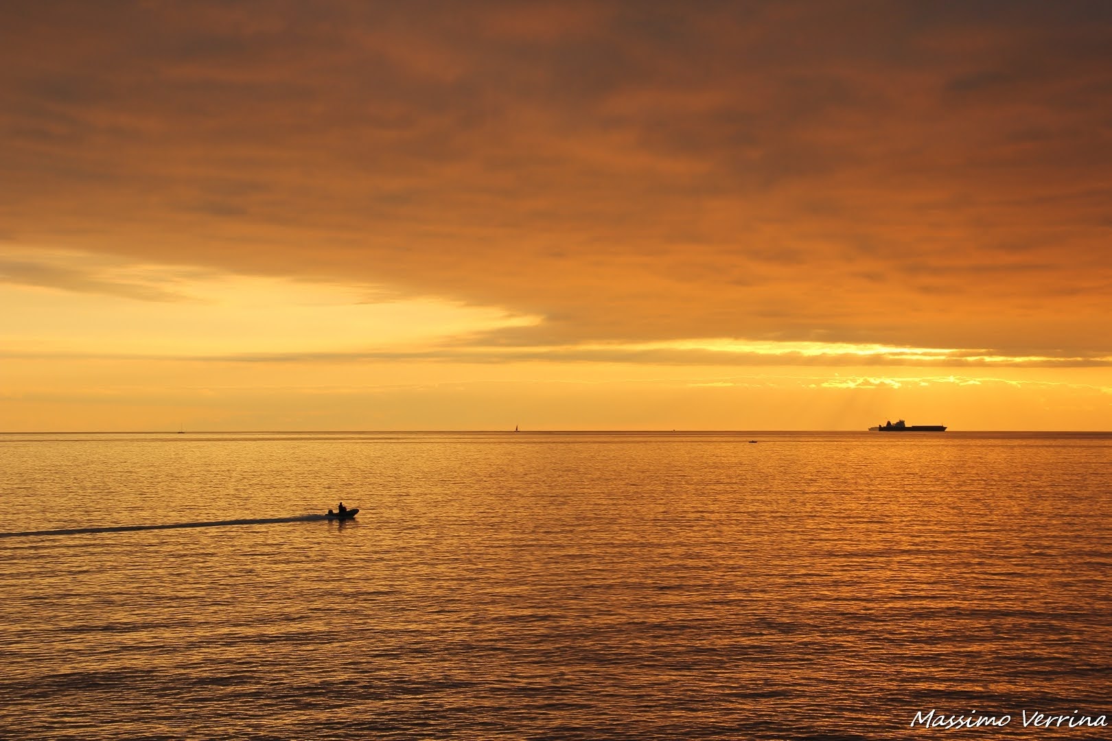 Più i minuti passavano e più il tramonto si accendeva di colore. Un veloce motoscafo entra nell’immagine. Come più volte detto una fotografia per essere corretta deve avere i soggetti che entrano nell’immagine se sono in movimento, come in questo caso, oppure posizionati nei terzi se sono statici….