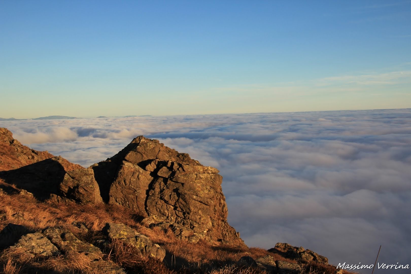 Mentre facevo ritorno mi volto verso nord, ecco sua maestà il Monviso e tutto il gruppo delle Alpi Occidentali. Sotto altri tappeti di nebbia coprivano borghi, colline, pianure, città…..