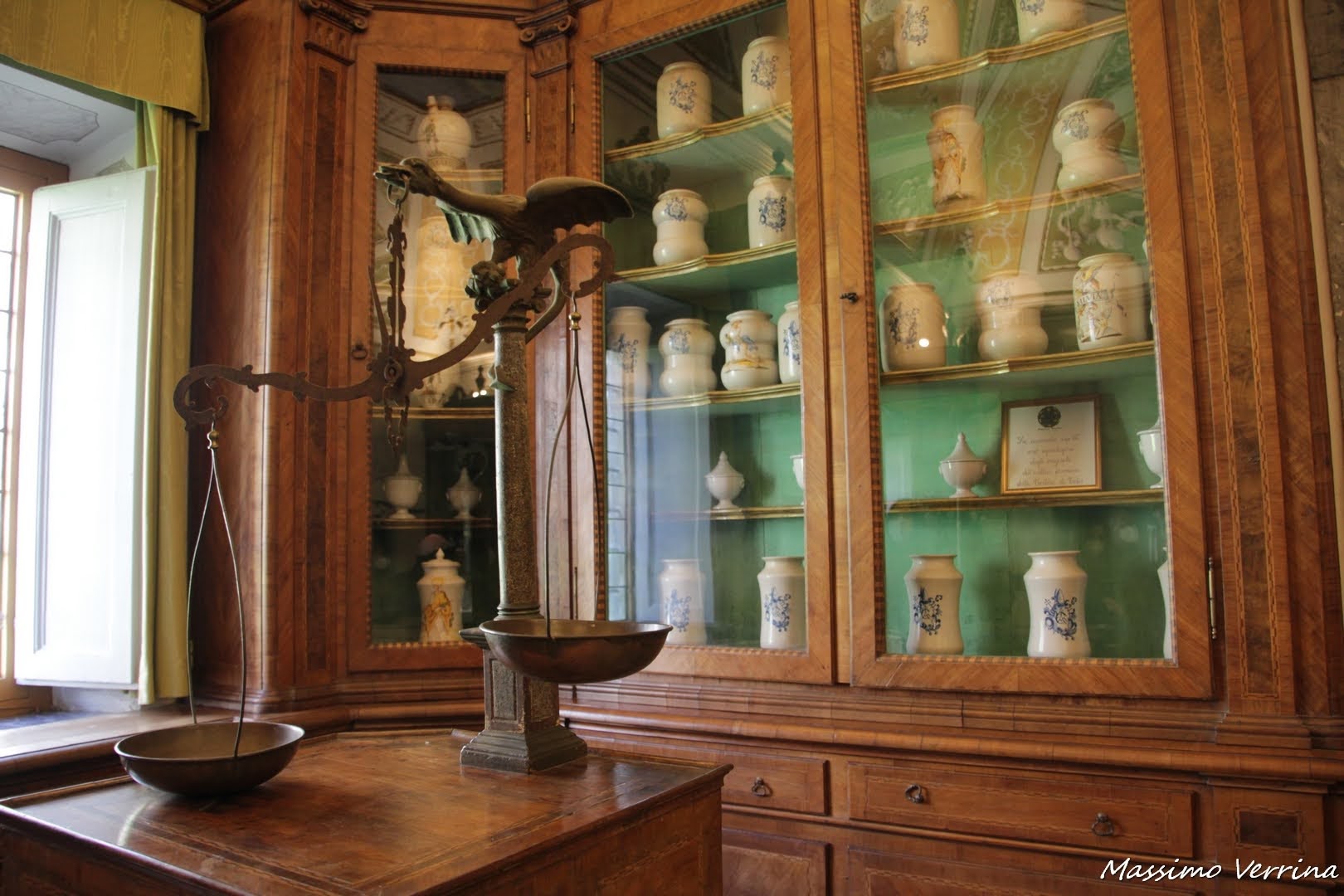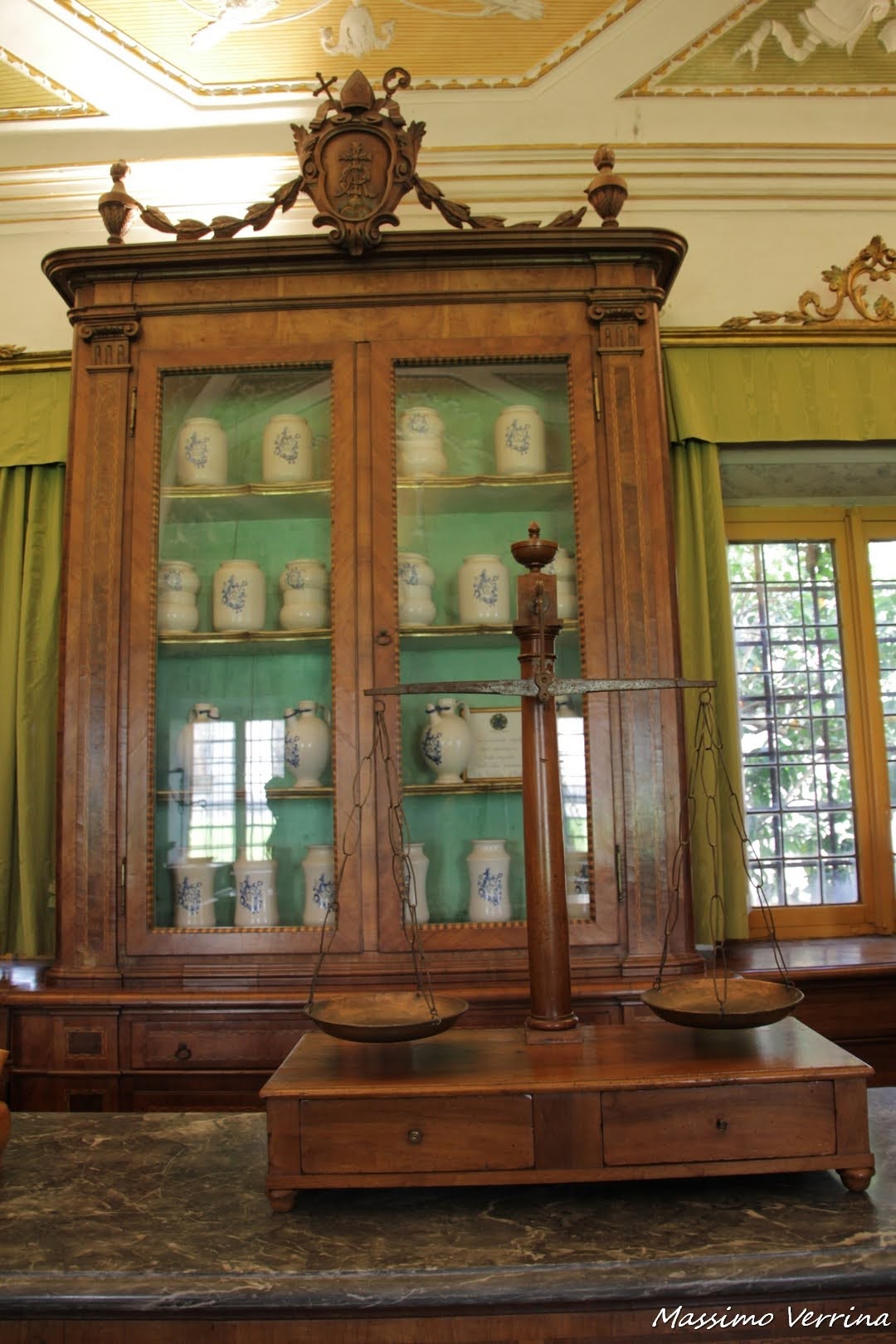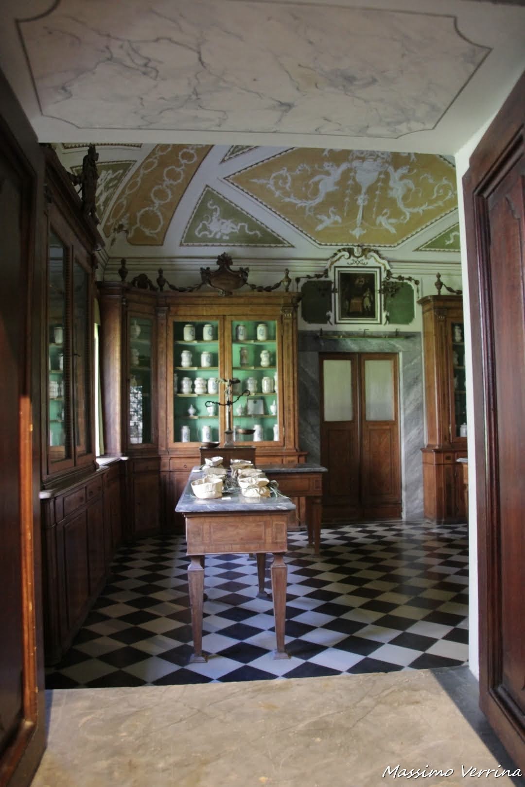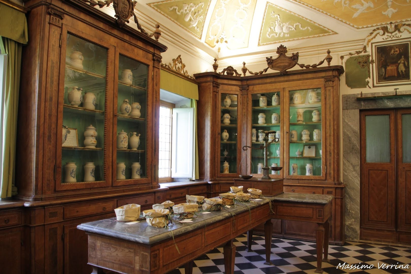 2. le cose che mi attirano maggiormente in un’abbazia o in un convento sono leerbe e le confetture dei monaci..qui addirittura un’antica farmacia!c he fascino! Hanno un che di magico…sempre delle meraviglie i dipinti, anche quello sul soffitto..e la finestra sul cortile con quel verde che si specchia, davvero un’atmosfera particolare! grazie Max e buona serata a te!