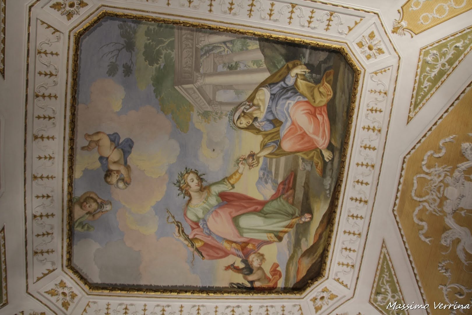 Poteva mancare un’opera d’arte anche in questa stanza? No, ed ecco infatti la volta di questo salone arricchita da un pregevole lavoro pittorico, che anche in questo caso non manca di catturare l’attenzione di chi vi entra per la prima volta…