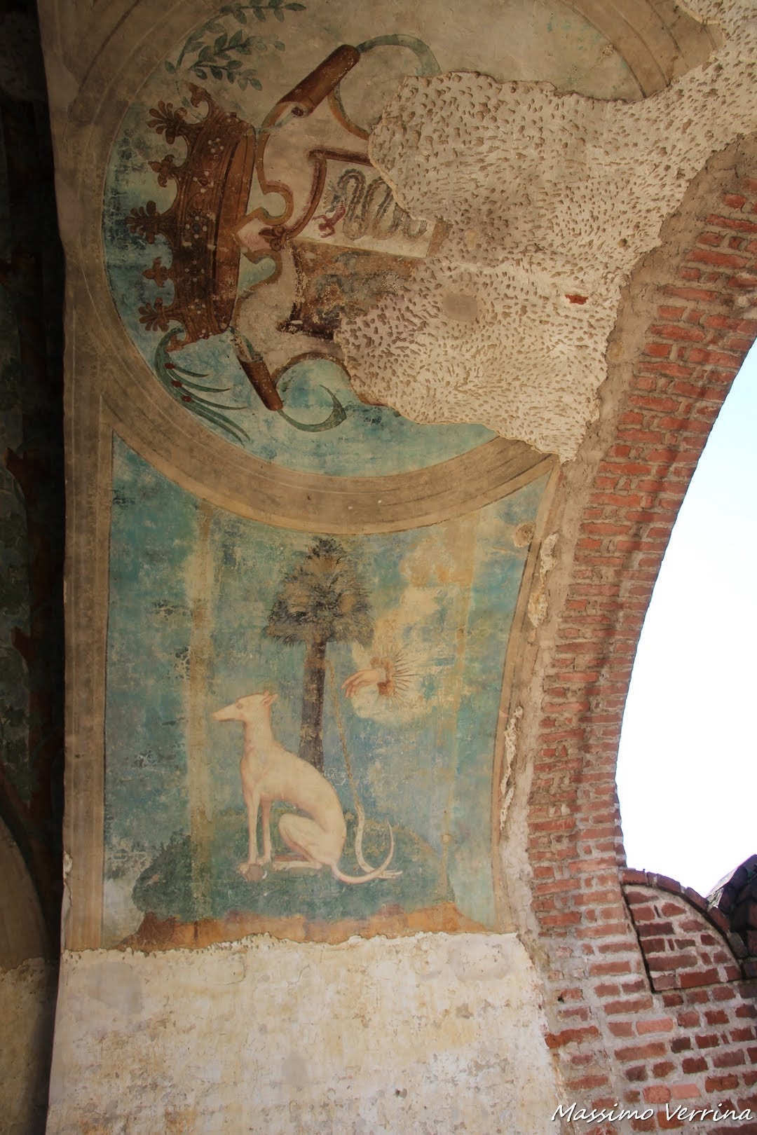 Il post di oggi lo apro con questi affreschi sbiaditi dal tempo, ma ancora parzialmente visibili, che fanno parte di quella torre sul lato sud dove un tempo sorgeva una piccola cappella. Notate il levriero, un cane molto in voga in quel periodo storico, presente in moltissime raffigurazioni….
