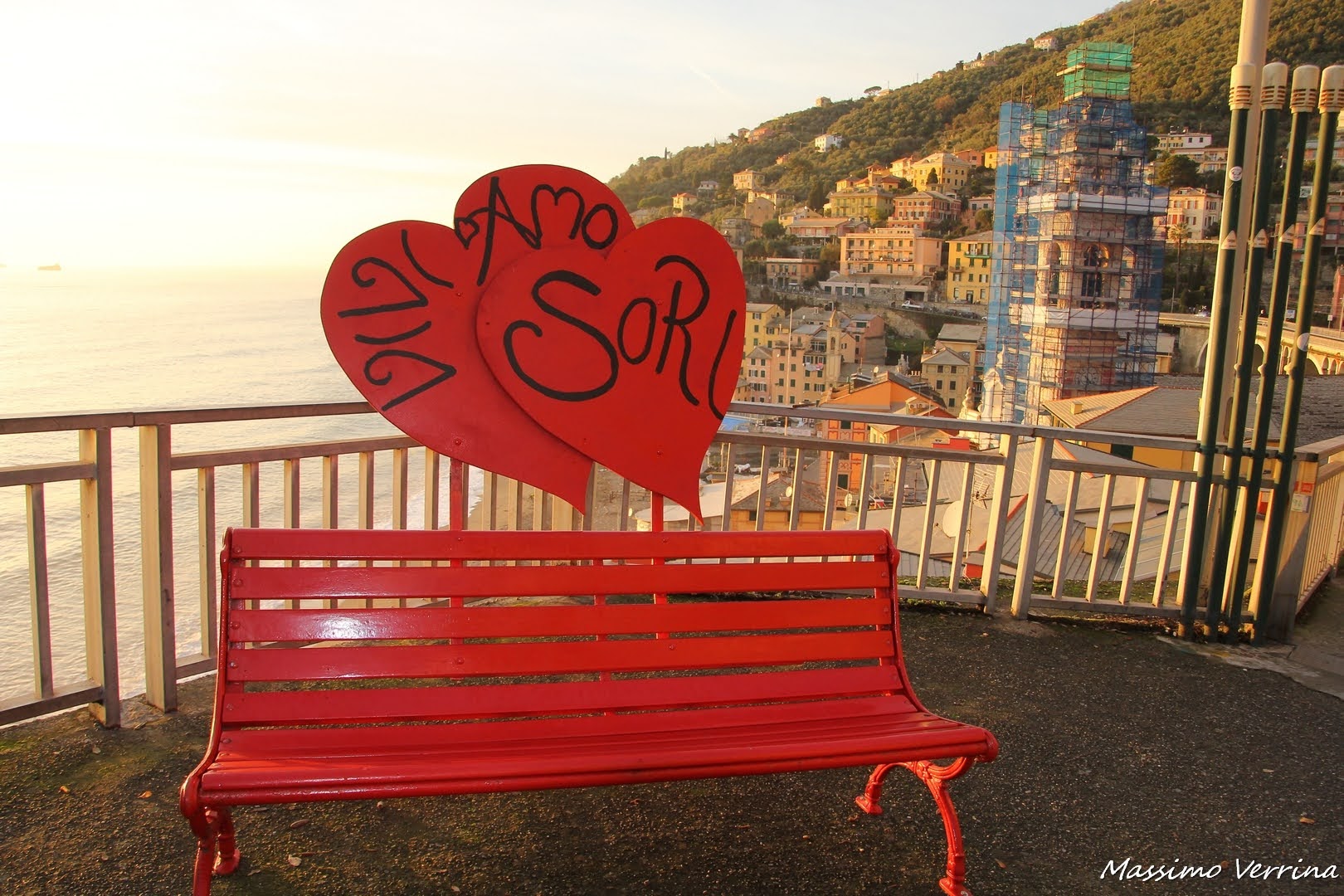 La copertina di oggi vi ha fatto vedere Sori per intero in quella luce rarefatta e calda che precede un tramonto d’inverno, sto andando verso la famosa scogliera, che si raggiunge attraverso una stretta stradina che scende subito dopo la stazione ferroviaria. Ma prima ecco un punto davvero originale che voglio farvi vedere, potrebbe sembrare una cartolina in stile San Valentino, ed in effetti Sori sa essere una meta molto romantica, ma guardate l’originalità di chi ha pensato d’installare questo cartello turistico sopra ad una panchina. Il gioco di parole è azzeccatissimo…